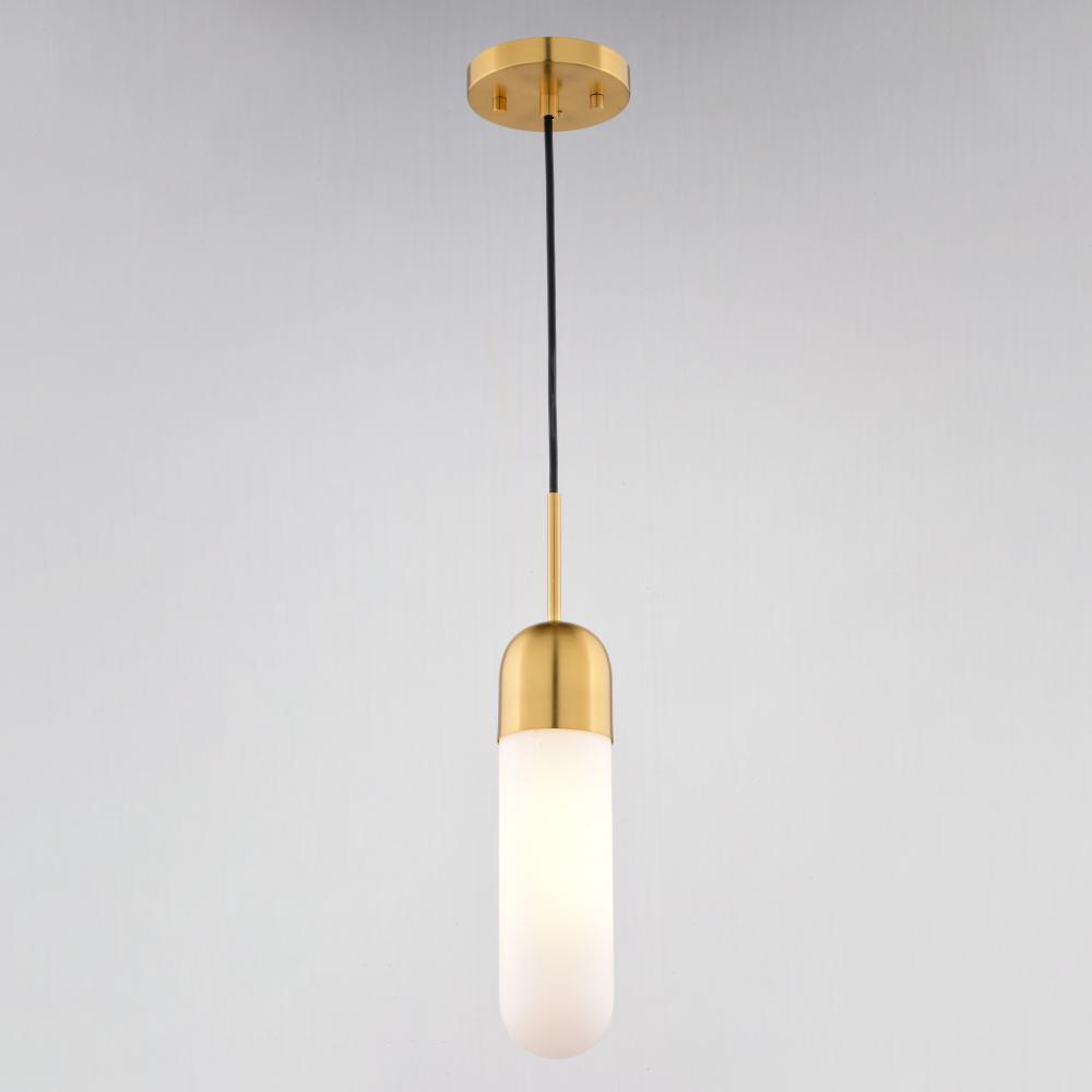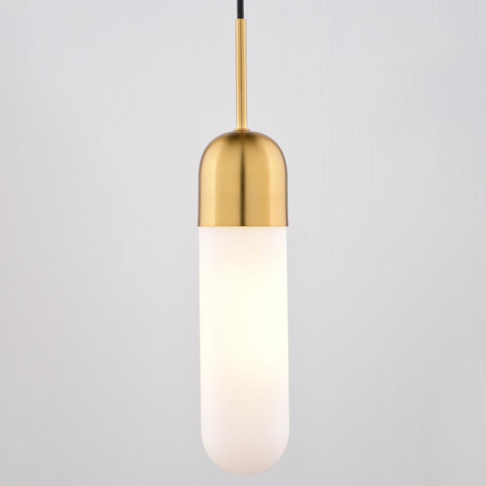 The Thalia Mini Pendant is a modern masterpiece for adding a playful sophistication to your kitchen. Its unique pill-shaped design with warm antique gold finish and soft white glass, provides a versatile aesthetic that will complement your contemporary, mid-century modern or even transitional style. The Thalia Mini Pendant is the perfect focal point for a breakfast bar or homework zone that craves a touch of modern whimsy.