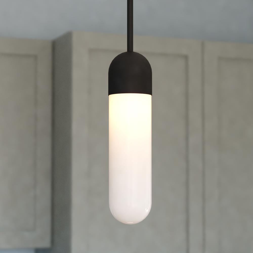 The Thalia Mini Pendant is a modern masterpiece for adding a playful sophistication to your kitchen. Its unique pill-shaped design with matte black finish and soft white glass, provides a versatile aesthetic that will complement your contemporary, mid-century modern or even transitional style. The Thalia Mini Pendant is the perfect focal point for a breakfast bar or homework zone that craves a touch of modern whimsy.