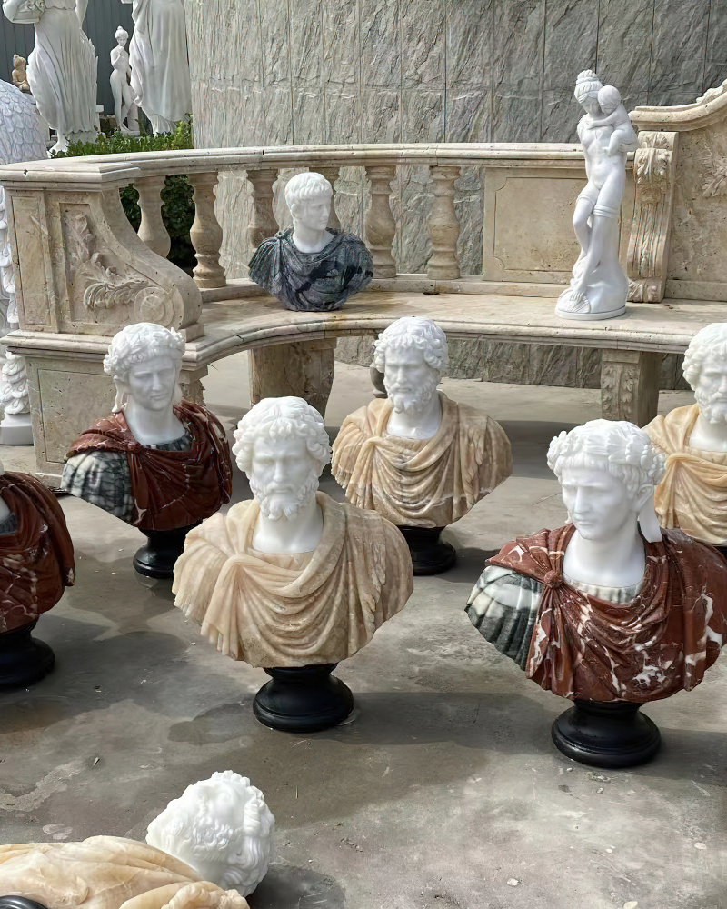 Creating the feel of flowing fabric from marble is a feat, as is evidenced by the Thanos Marble Bust Sculpture. Carved from different types of Italian marble, the Roman bust was inspired by the antiquity period of that great empire. The style of the base on which the bust sits is aesthetically in keeping with an antique sculpture. The color of the marble that makes up the clothing on the gold sculpture will make it a focal point in a room.