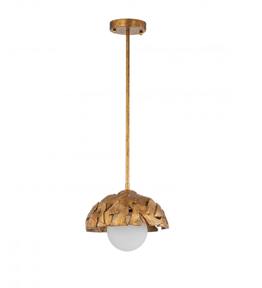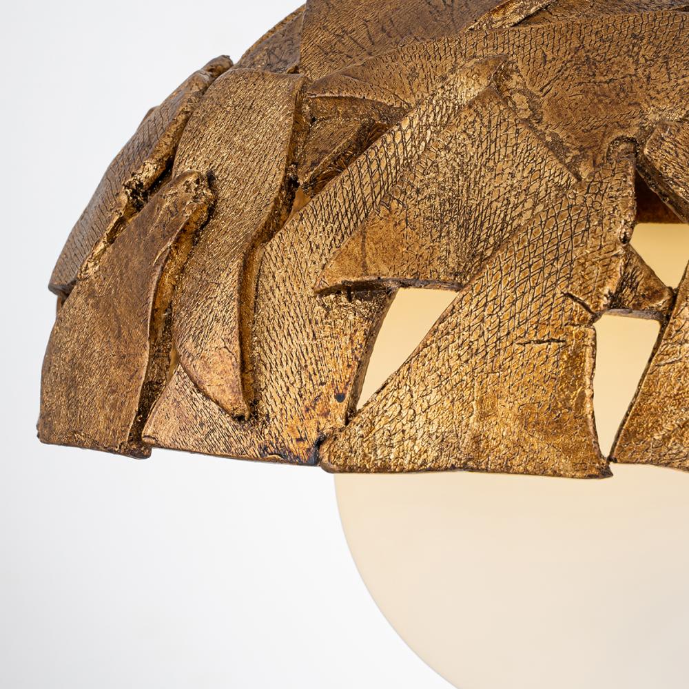 Mosaic Luxe 10.5" light: frosted glass center for even down light contrasts textured gold leaf strips in a bold pattern. Functional as a pendant or semi-flush mount.