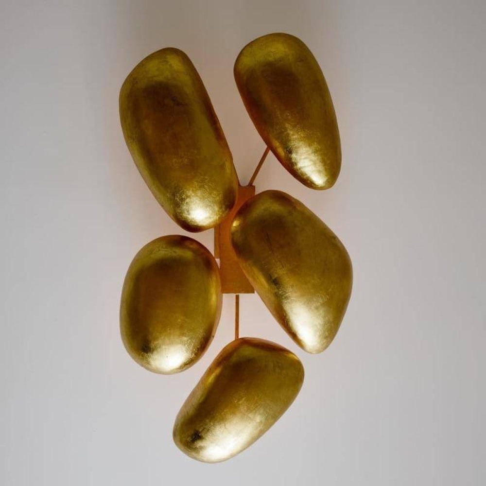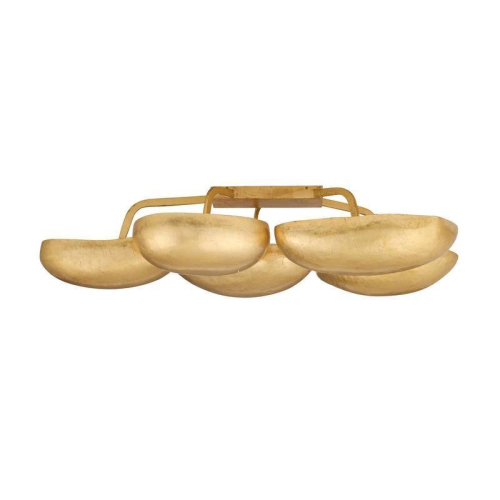 With five sculptural pod-shaped shades, the Theo flush mount is a bold accent in any space. In our gold-leafed iron finish, this fixture is organic and opulent with inverted shades that illuminate the room with a warm, upward glow. Finish will vary.