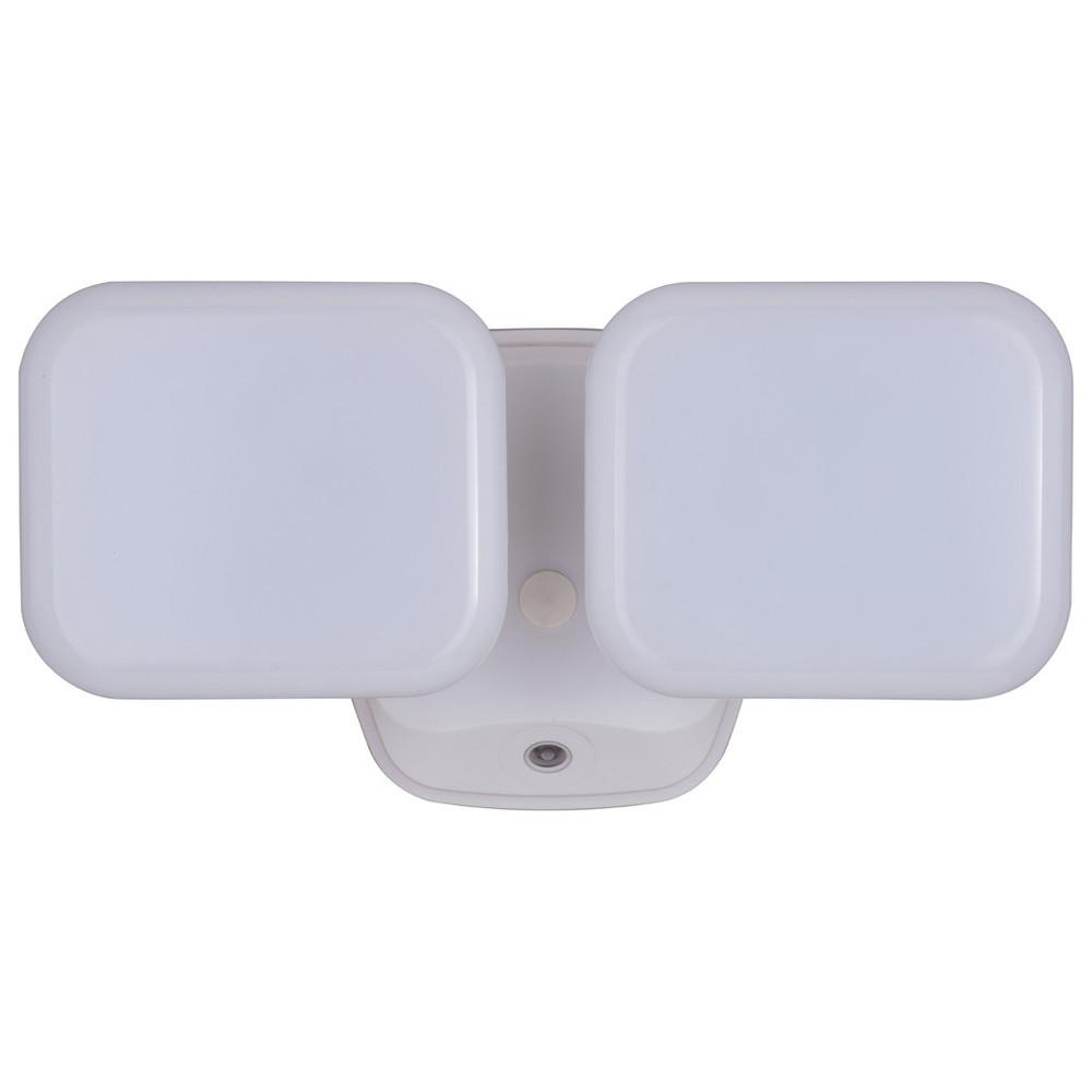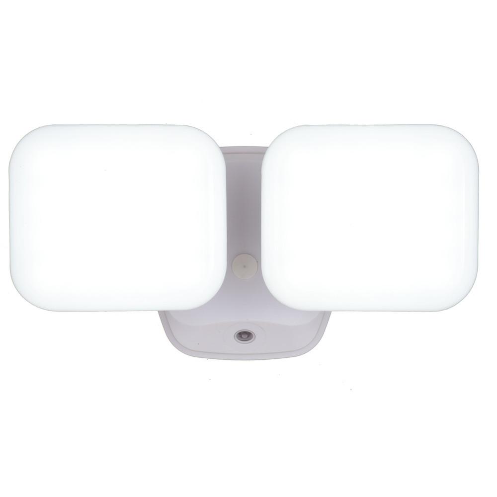 The white Theta 2-light LED outdoor dusk to dawn flood light expands the functionality, safety and security of your home's outdoor spaces with the confidence of knowing brilliant illumination will be there from dusk to dawn. The two modern light heads are fully adjustable and deliver 2200 lumens of 5000K light throughout the night.
