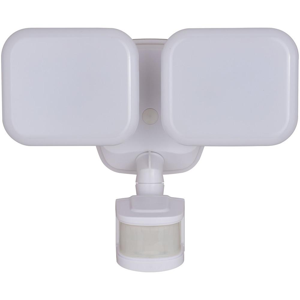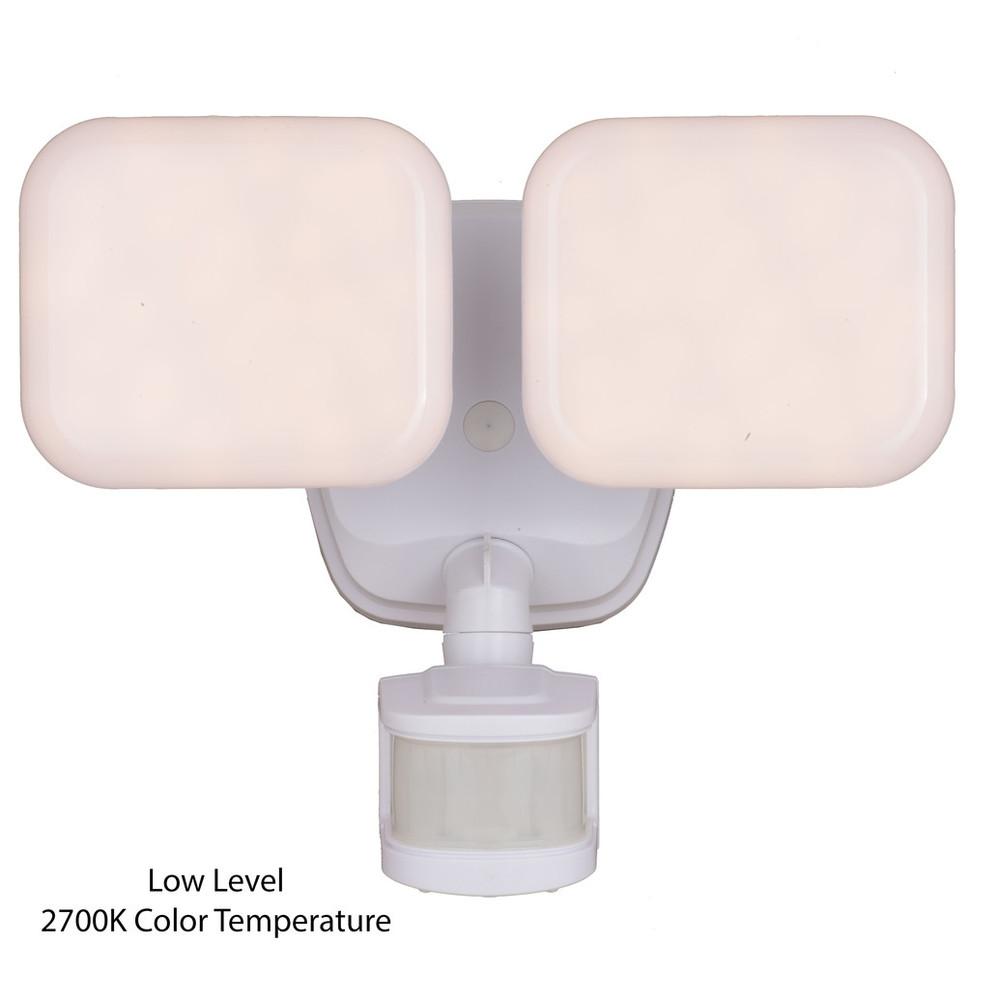 The white Theta 2-light LED outdoor motion sensor flood light provides low level 2700K ambient lighting throughout the night and bright 5000K high level when motion is detected. The modern light heads are fully adjustable and deliver 2200 lumens to keep your home's exterior brighter at dusk, dimmer at night, and instantly bright when motion is detected. This dualux security light expands the functionality, safety, and security of your home's outdoor spaces with bright, reliable light when and where it is needed.