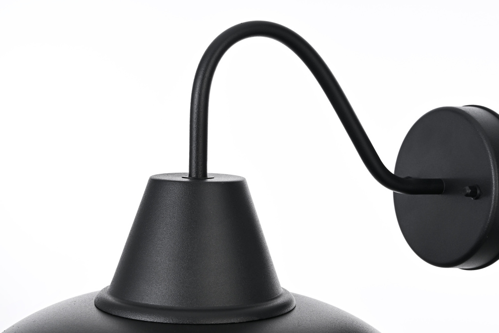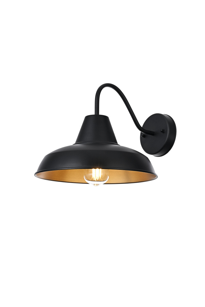 This outdoor wall light brings a timeless barn-style aesthetic to exterior spaces, featuring a flared metal shade, curved gooseneck arm, and contrasting black-and-gold finish. The wide metal shade directs light downward, while the gold interior enhances brightness with a warm, reflective glow. Built from sturdy iron, this fixture is ETL Wet Rated for durability in porches, patios, garages, and farmhouse exteriors. The compact 5-inch round backplate provides a secure mount, and the dimmable functionality allows for adjustable brightness when paired with a compatible dimmer. Designed for a medium-base E26 bulb (not included), this fixture blends practical lighting with industrial character, making it a strong and stylish addition to any outdoor space. Built with marine-grade, corrosion-resistant aluminum, this sconce withstands coastal conditions for long-lasting durability.