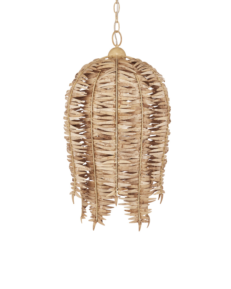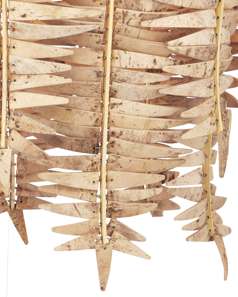 A tremendous amount of effort goes into creating the Tiptur Pendant, as the coconut shells are cut, bleached, drilled, and pinned to the frame by hand to form its bell shape. Tied to thin ribs of wrought iron in a coco cream finish, the color of the shells blends beautifully with the metal to create a veritable work of art. Adjustable from 34" to 102" with use of included chain/rod kit/cable. If your space calls for a longer drop, additional chain/rods/cable is available for purchase.