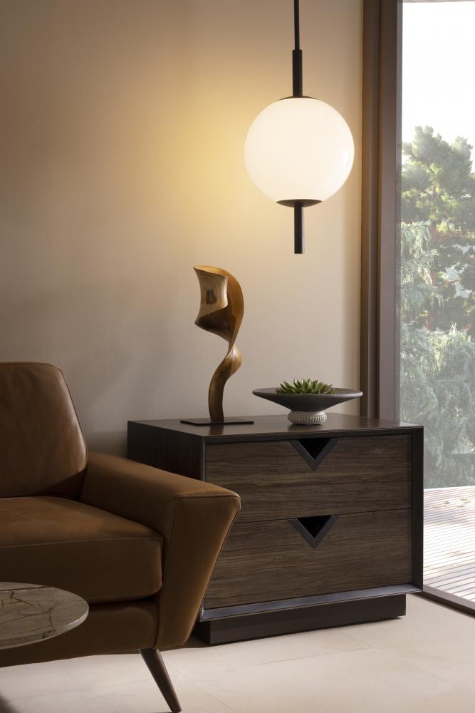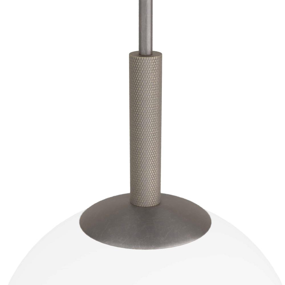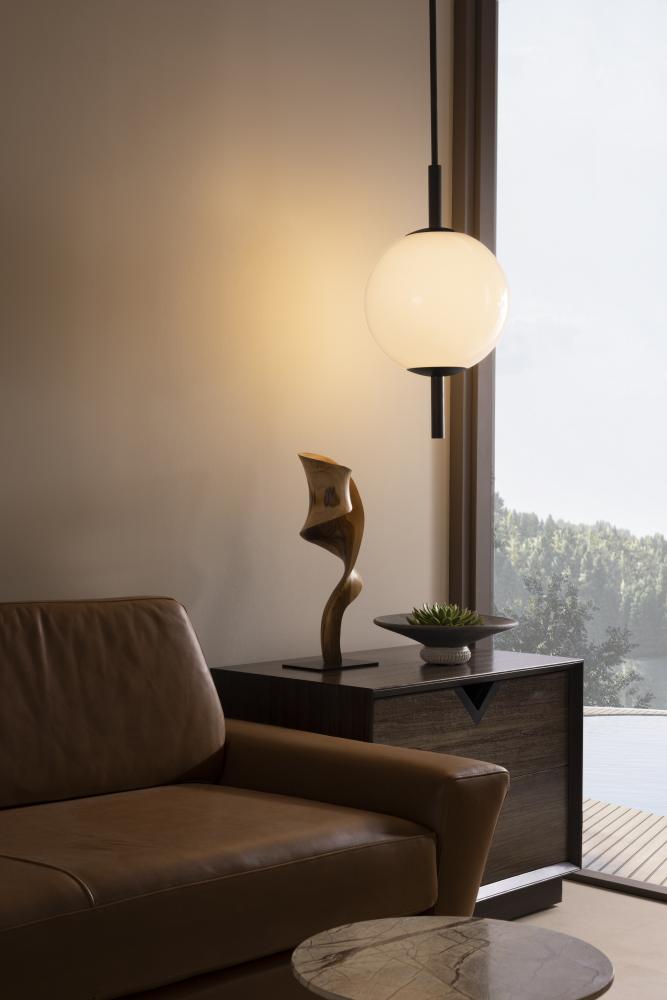 STRIKING IN ITS SIMPLICITY, THE TIRSO EXUDES MIDCENTURY STYLE. THE INTEGRATED LED PENDANT IS CREATED WITH A GLOBE SHADE IN OPAL GLASS, WHICH EMITS A SOFT GLOW. A PIPE SUSPENSION, IN ENGLISH BRONZE STEEL WITH KNURLED DETAILING, CREATES A PIERCING EFFECT. THE FIXTURE IS FITTED WITH A DISC CANOPY, ALSO IN ENGLISH BRONZE. DAMP-RATED, ALTHOUGH LIMITED COVERED OUTDOOR CONDITIONS MAY AFFECT FINISH.
