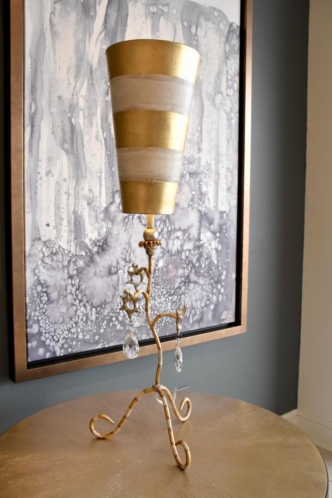 A distressed gold buffet lamp with a striped wrought iron stem and upside-down tapered shade. Its shabby chic style adds whimsical elegance to entryways or master suites.