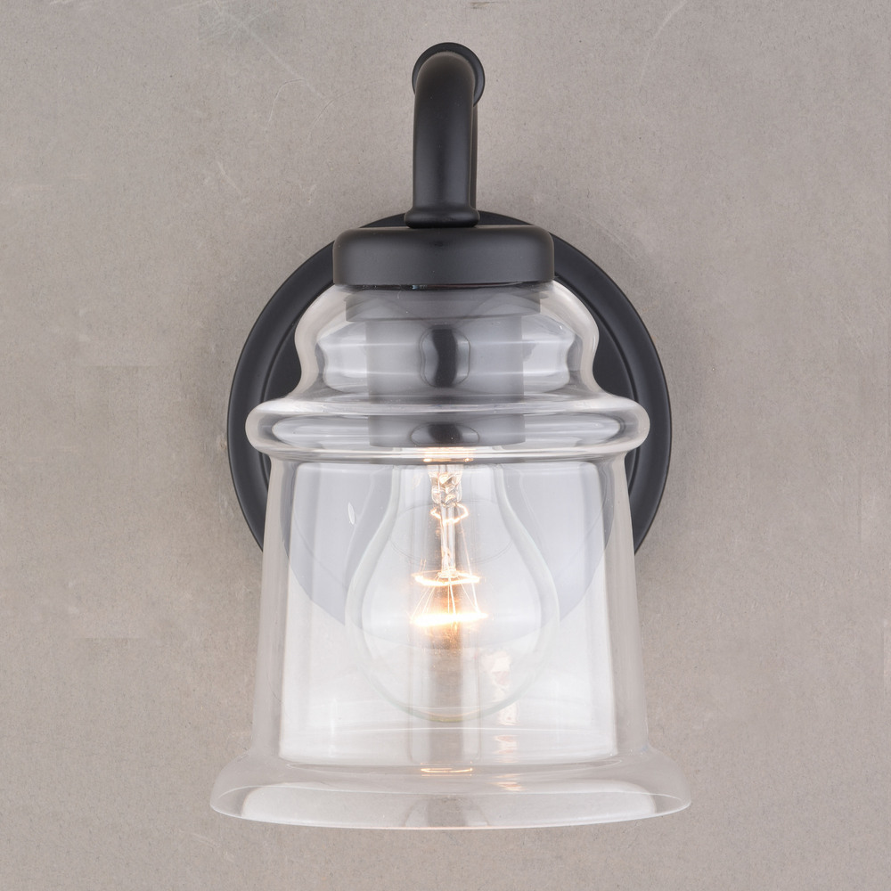 Clean retro lines define this beautiful collection called Toledo. Notes of industrial and farmhouse tradition are defined with the elegance of clear blown glass. Combine that with a vintage Edison style filament bulb to complete the look. Versatile reversible mounting option lets you install this fixture up or down. This wall sconce is ideal for bathrooms, hallways, stairways, and foyers.