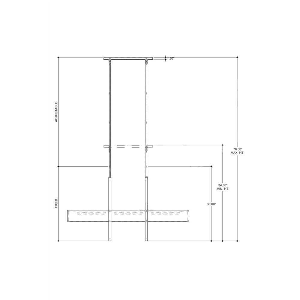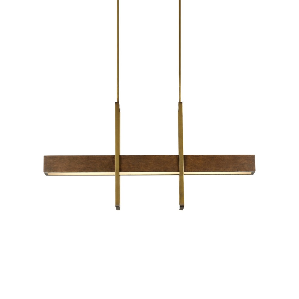 A sophisticated arrangement of rectilinear shapes, the Tonbridge Linear Chandelier features a rich mix of materials. The vertical rectangles are made of metal in a painted brass finish, while the horizontal wood element showcases a warm chestnut wood finish. Designed with long kitchen counters and dining tables in mind, the wood rectangle is fitted with an acrylic diffuser to soften the illumination. A design detail of note is how the painted brass elements have a bit of antiquing on the corners. Adjustable from 34" to 76" with use of included chain/rod kit/cable. If your space calls for a longer drop, additional chain/rods/cable is available for purchase.