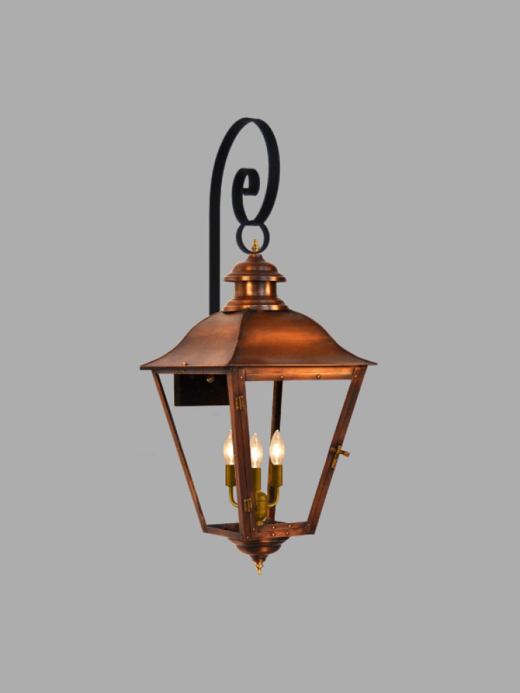 Aluminum accessory that mounts to the wall bracket and top of lantern, scrolls forward towards the front of lantern, for more decorative fixture.