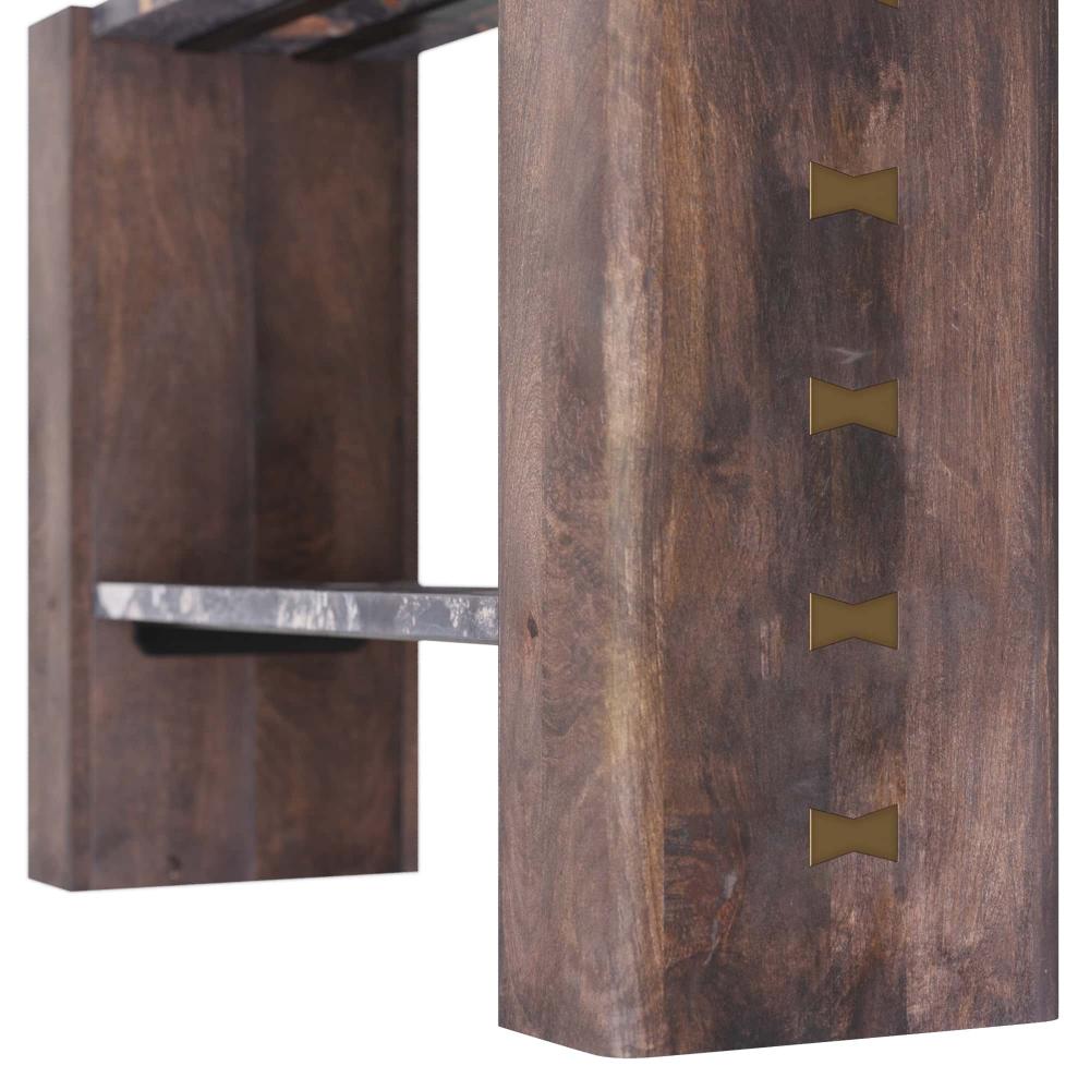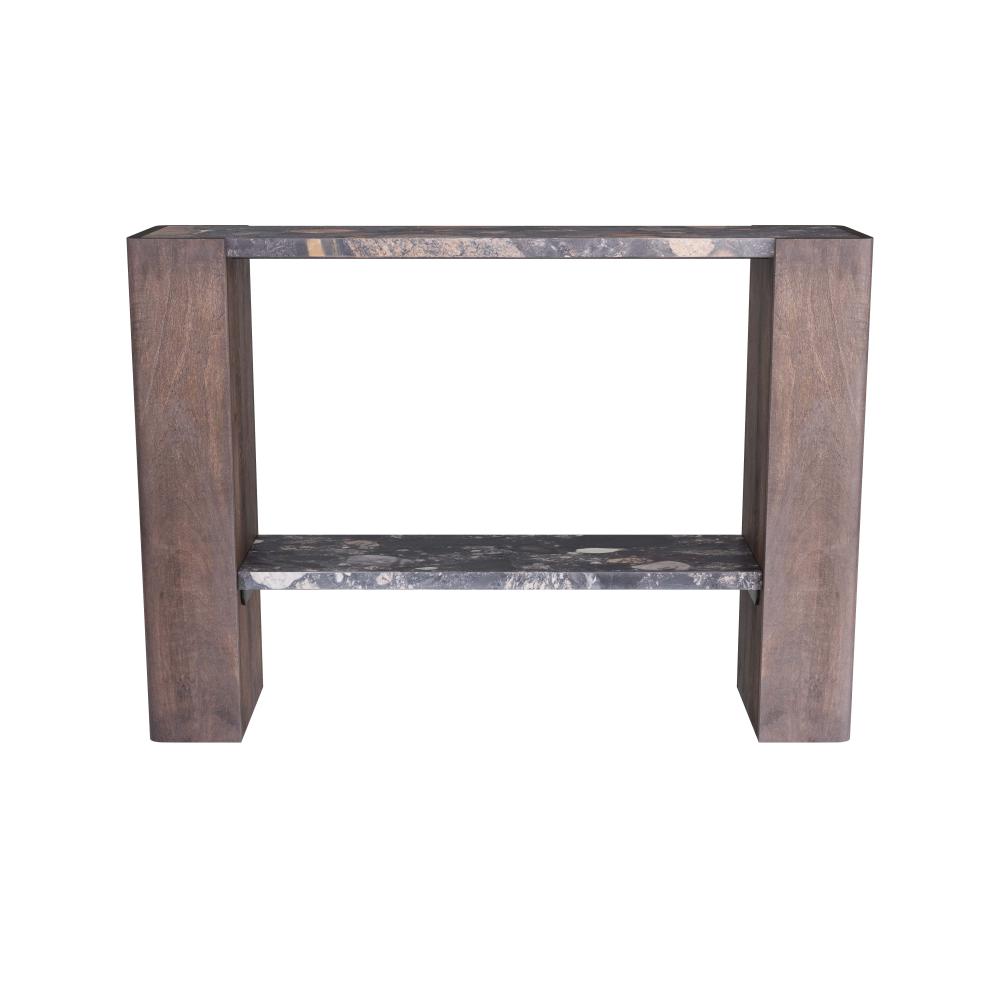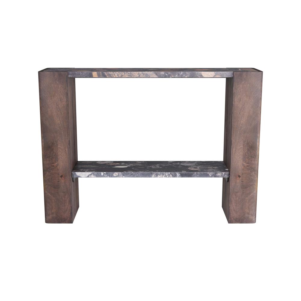 A RICH COMPOSITION OF NATURAL MATERIALS, THE TORELLI CONSOLE MAKES A HANDSOME ADDITION TO ANY INTERIOR. MONUMENTAL UMBER-FINISHED MANGO WOOD LEGS CREATE A FOUNDATION FOR NEUTRAL CASPIAN MARBLE SURFACES. THE TACTILE, LEATHERED MARBLE FEATURES SIZABLE, TERRAZZO-STYLE PARTICULATE. ANTIQUE-BRASS IRON BOWTIE-SHAPED INLAYS ORNAMENT THE SIDES OF EACH LEG. FINISH WILL VARY.
