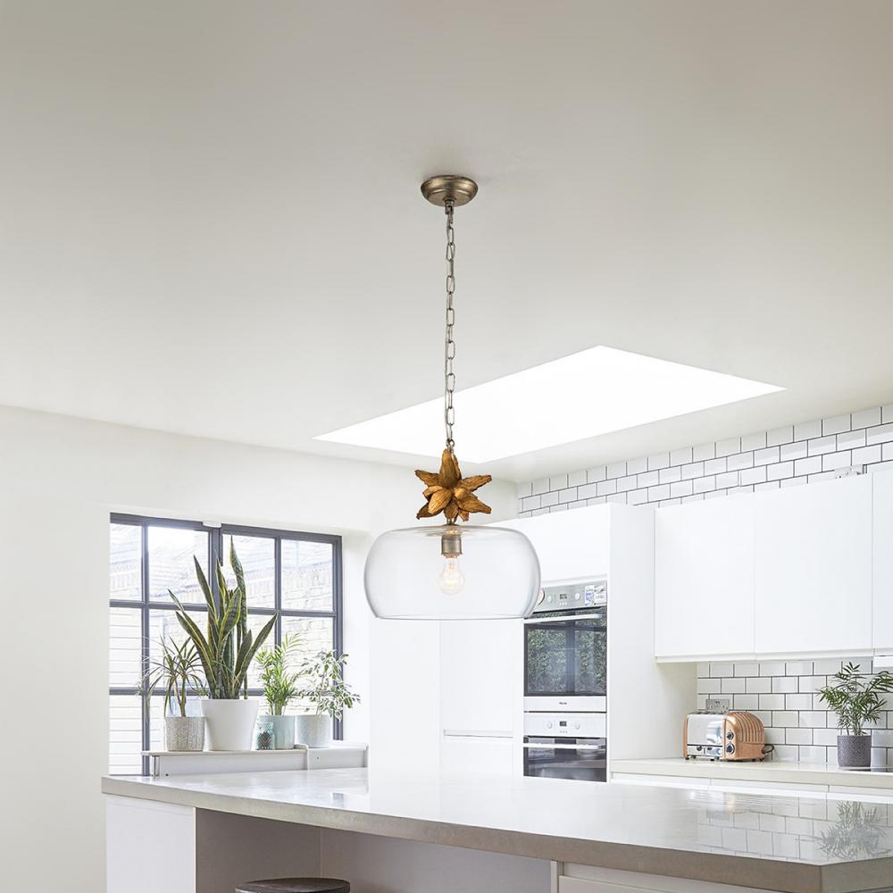 Toussant 1 Light Pendant. Delicately shaped gilded petals highlight this design by Elaine Gleason.