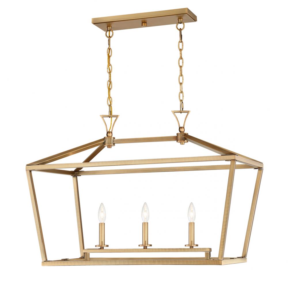 The Savoy House Townsend 3-light trestle offers up a casual open lantern look that is the perfect addition for any space inside the home. warm brass finish. Trestle lights are ideal for use over rectangular dining room tables or kitchen islands, but you can also use them in living rooms, great rooms, over pool tables and in media rooms, too. Bulbs not included. Try using stylized bulbs like Edison or tubular bulbs for a different look! The warm brass finish can be matched with brass hardware or mixed with hardware in other finishes. Townsend is a great option for adding a bold touch to rooms in transitional, farmhouse or classic style. When you choose a Savoy House lighting fixture, you can be certain you've selected a piece that will withstand the test of time.