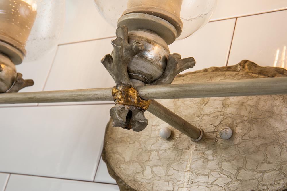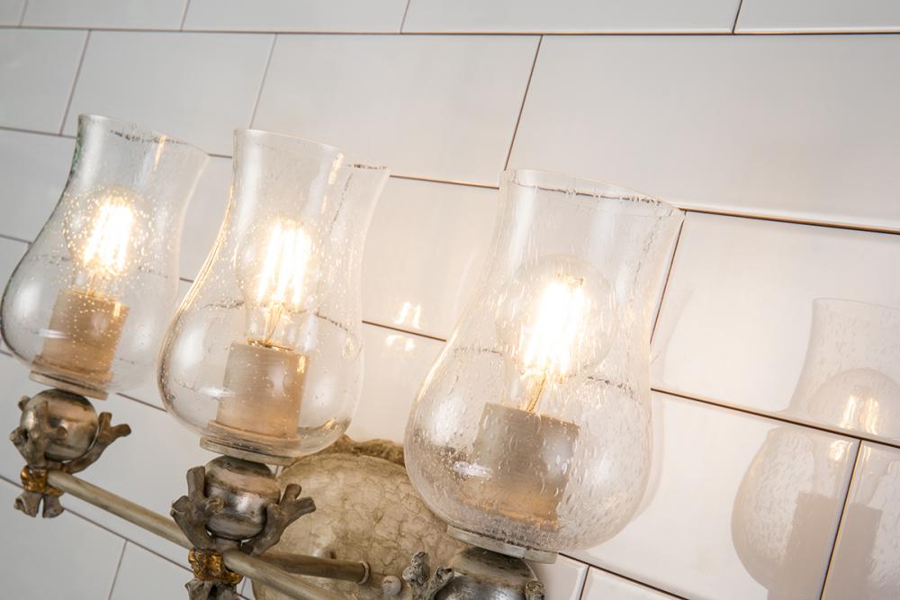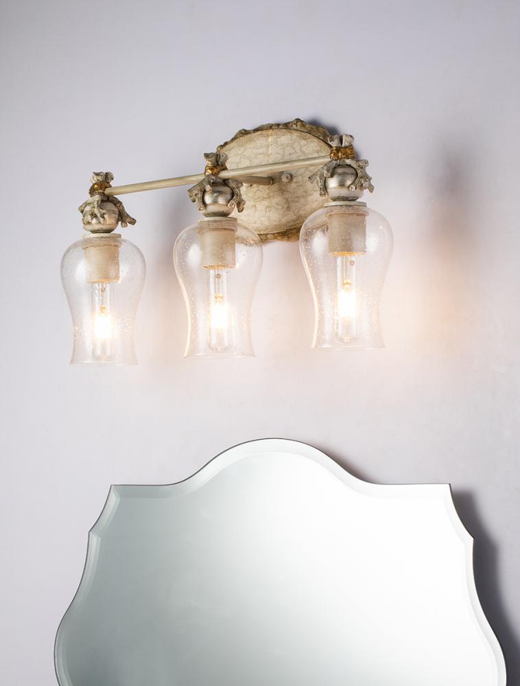 A 3-light vanity mixing vintage and modern with seedy glass hurricane shades, a cream-silver oval backplate, and gold-silver orb accents. Gold-brown edging adds depth, perfect for a fresh bathroom or living room design.
