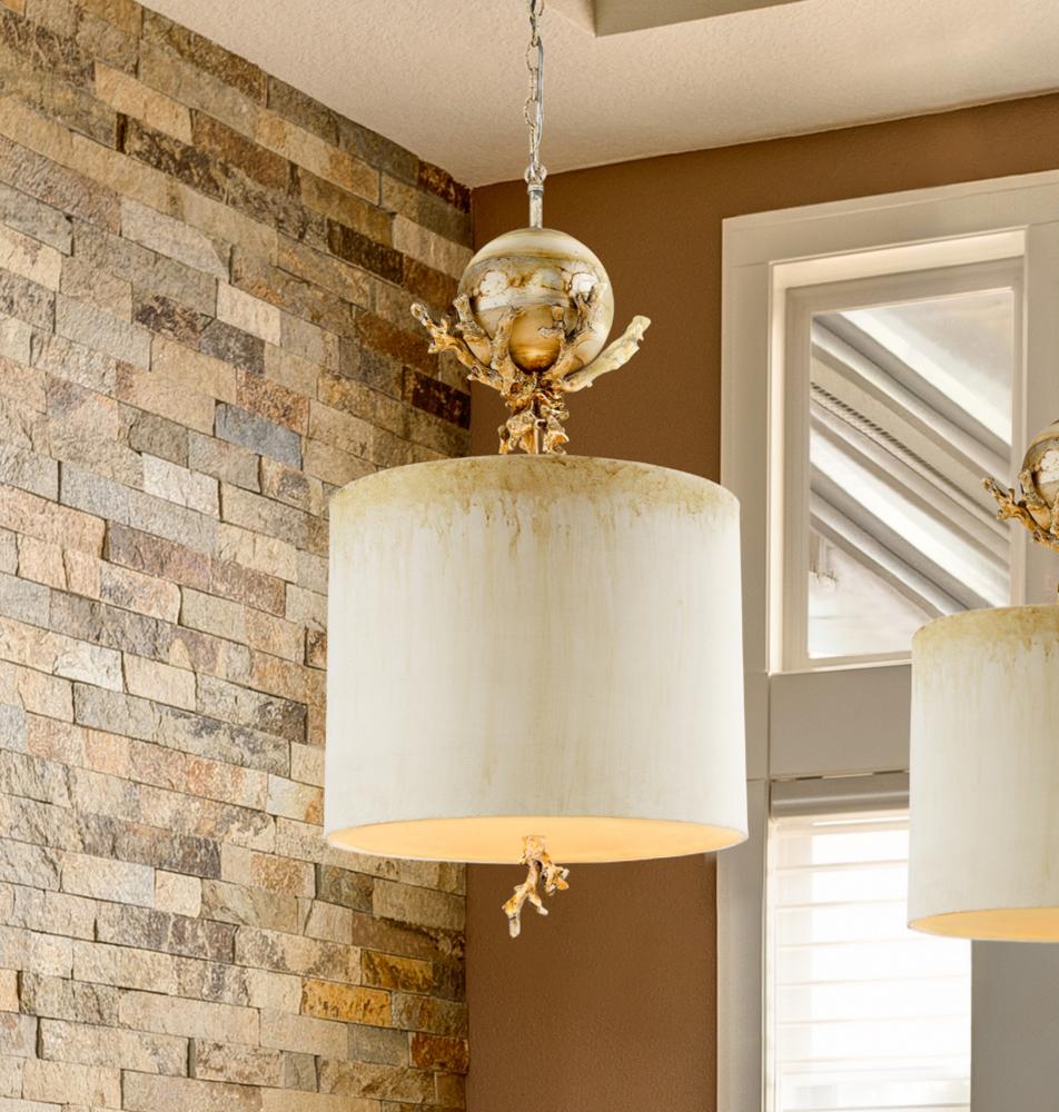 Trellis Pendant: organic ivory drum shade, 15" diameter, with dripped glazes for a whimsical touch. Adjustable height, finished with a finial and diffuser for a soft, feminine glow in eclectic decor.