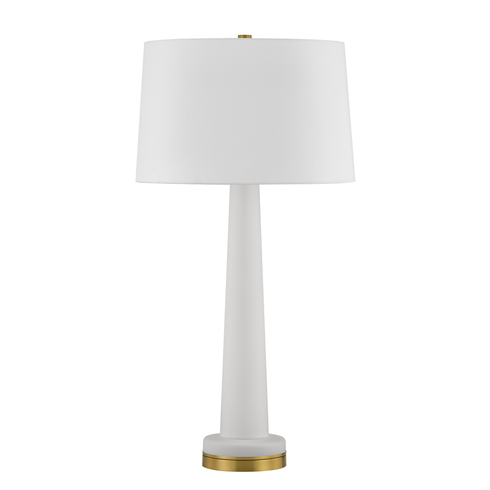 The Savoy House Trenton 1-light table lamp was designed by Dann Foley, an award-winning interior designer known for elevated, timeless taste. Its frosted glass body, white fabric shade and Warm Brass finish come together to create a classic, graceful silhouette that suits a wide range of interiors. Trenton is 30.75" in height and 16" in width. It uses one standard size bulb of up to 100 watts. Bulb not included.