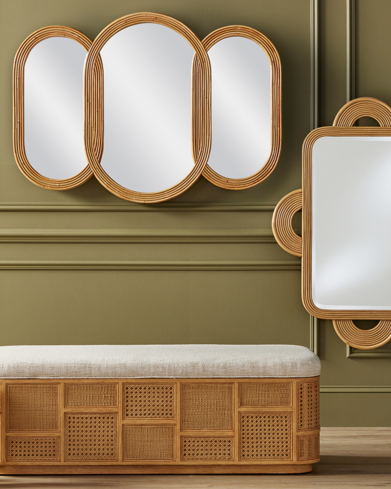 The Triboa Mirror is handmade of arurog, the rounded shapes extremely difficult to achieve with such a strong material. The natural color variations of the reeds enliven the tan decorative mirror with patina. A finely designed detail is how the layers of the natural material thicken the frame around the mirrored glass. This treatment brings depth to the artisanal piece and illustrates the painstaking efforts our craftspeople put into our designs.