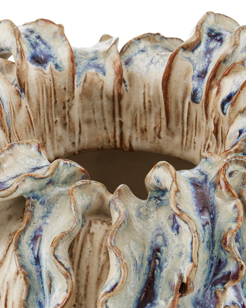 The Tropical Crown Small Vase is made of ceramic glazed in a mix of ivory and reactive blue. The leaves of the ivory vase that form the ruffles are done by hand using the pain-staking pinch method by a group of women artisans. Then the reactive blue glazing is dripped on them in an artisanal flourish.