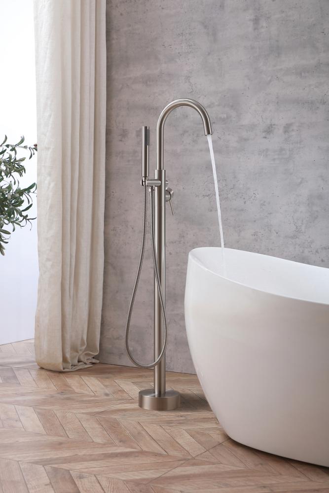 Our floor-mounted bathtub faucet brings a touch of space-saving elegance to your bathroom.