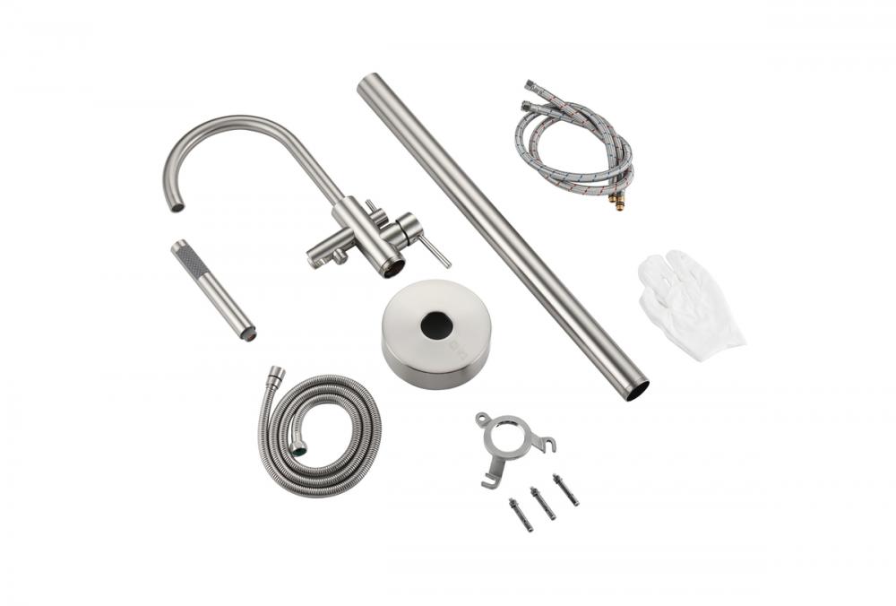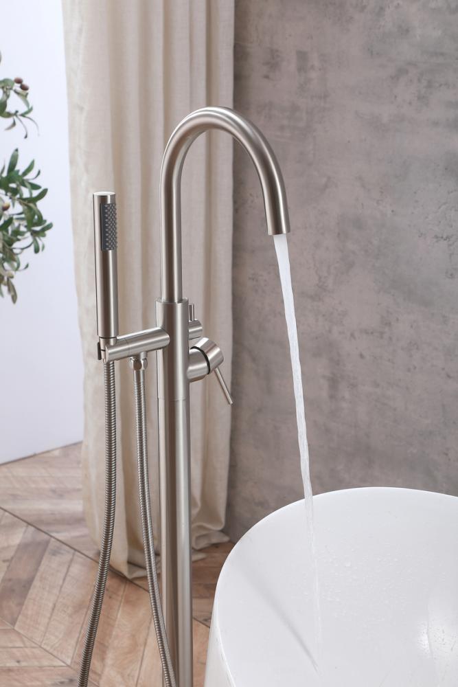 Indulge the ultimate in bath versatility with our bathtub faucet, complete with a convenient 32-inch long hand shower, bringing flexibility to your bathing routine. Choose between a soothing bath or a targeted hand shower experience, catering to your preferences. Crafted from premium stainless steel, our faucet not only adds a modern aesthetic to your bathroom but is also corrosion-resistant and built to last. With included supply lines, installation becomes hassle-free, saving you time and effort. The faucet's handy diverter lever enables effortless switching between the faucet and hand shower, allowing for a personalized bathing experience. Our bathtub faucet is UPC and IAPMO certified, ensuring lead-free materials and top-notch quality for your safety and satisfaction. Enjoy a maximum flow rate of 5.6 gallons per minute at 80 psi, offering robust water flow while conserving water and reducing utility costs. Embrace the elegance of our floor-mounted bathtub faucet, a space-saving alternative that exudes contemporary luxury, standing gracefully on your bathroom floor and complementing your decor with a touch of sophistication.