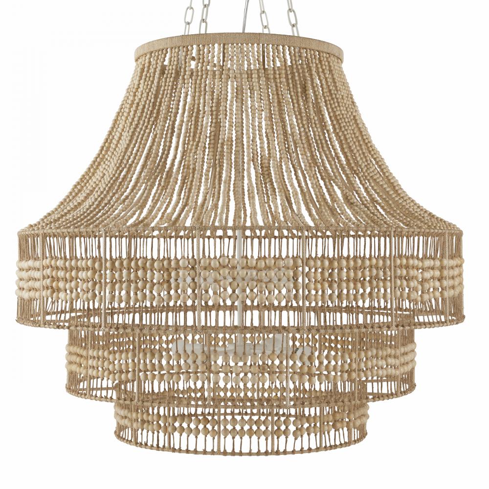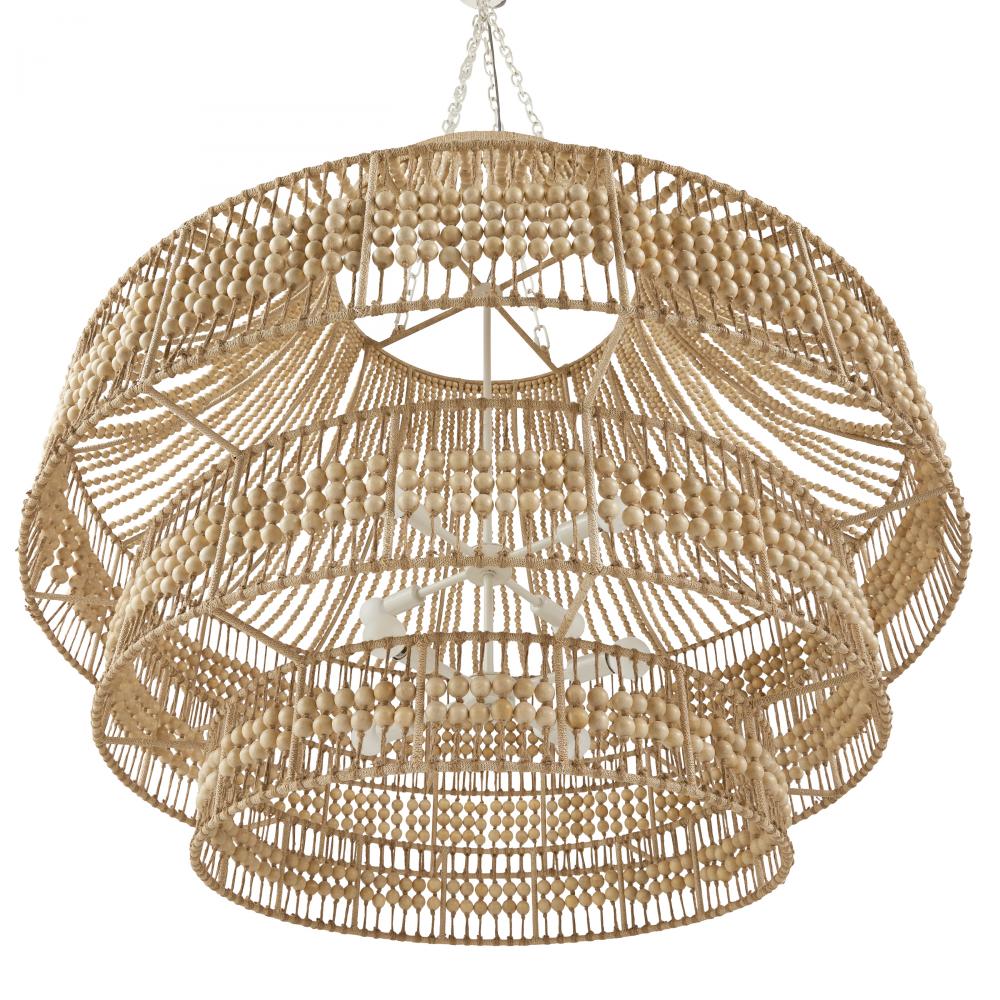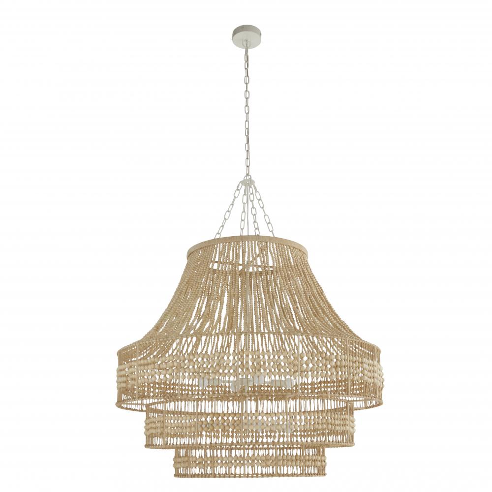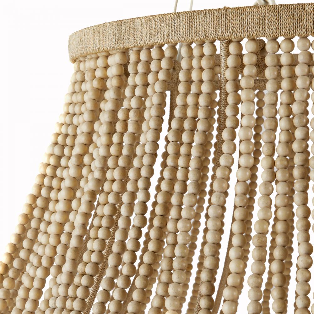 An oversized twist on the traditional empire chandelier, the Tulane establishes a strong presence while remaining light and airy. The tiered construction is crafted from hand-cut natural wooden beads along a natural abaca-wrapped frame, delivering a rustic element to its feminine form. The large-scale open-form structure allows light to cascade down each layer, brilliantly illuminating its surroundings. Finish will vary.