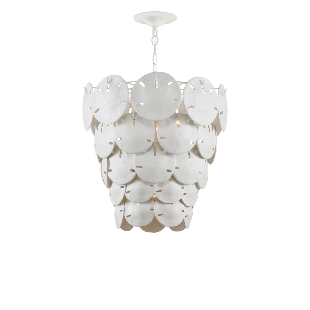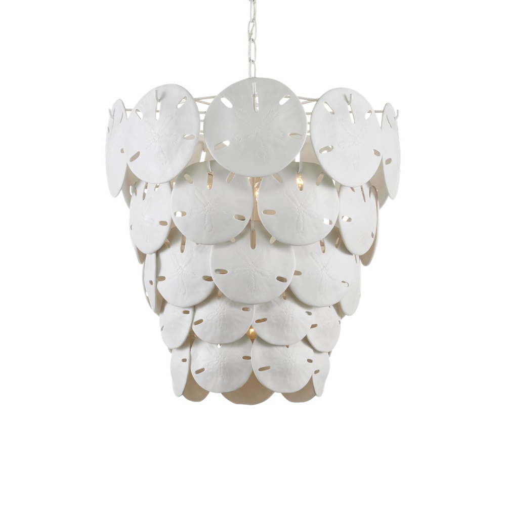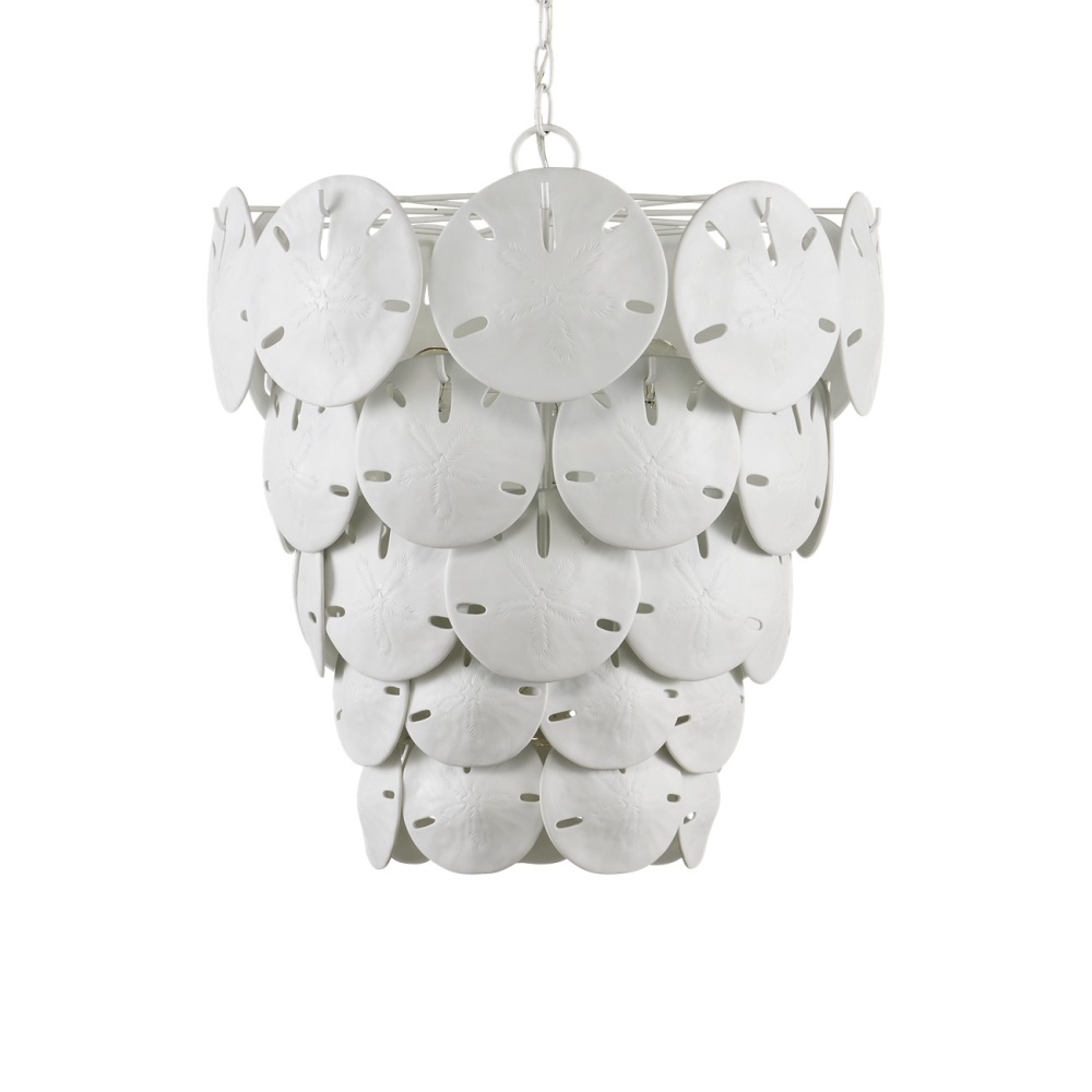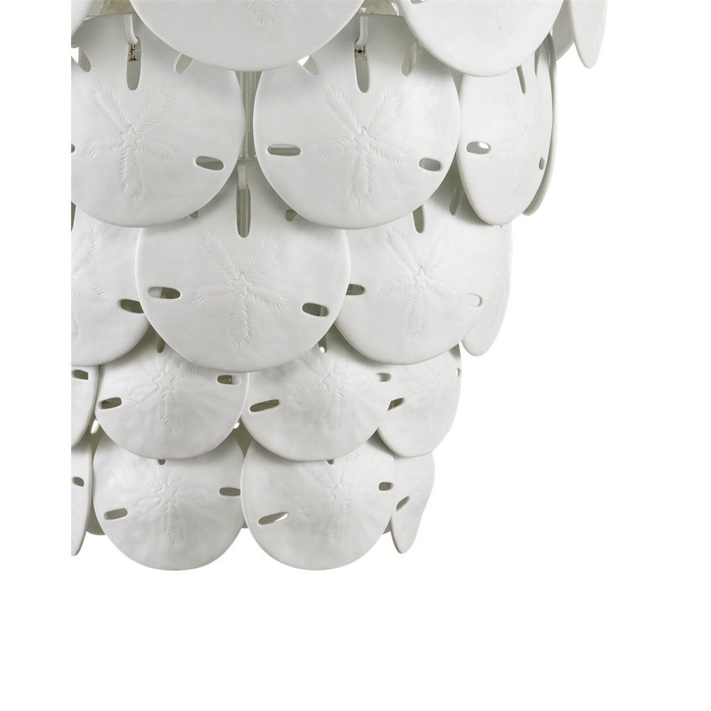 Marjorie Skouras designed the Tulum White Chandelier, inspired by the tropical beauty of the Yucatan Peninsula where she lives. This is a beautifully delicate design, as the sand dollars are cast in semi-translucent bone China and they make a pretty sound when a breeze ruffles them. There are three sizes of removable sand dollars on this design, which makes it easy to clean them. The sugar white finish on the hardware complements the pale discs on this nature-inspired chandelier, making it apropos for rooms overlooking the ocean. Adjustable from 28.5" to 96.5" with use of included chain/rod kit/cable. If your space calls for a longer drop, additional chain/rods/cable is available for purchase.