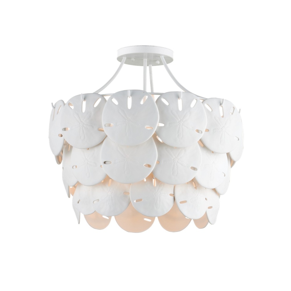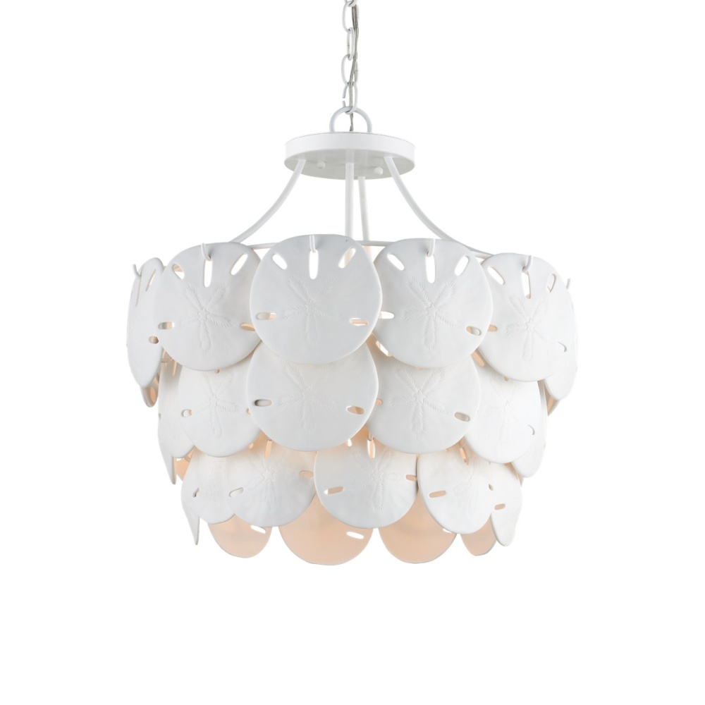 Marjorie Skouras designed the Tulum Medium Chandelier, inspired by the tropical beauty of the Yucatan Peninsula where she lives. This is an elegantly delicate design, as the sand dollars are cast in semi-translucent bone China and they make a pretty sound when a strong breeze ruffles them. There are three sizes of removable sand dollars on this design, which makes it easy to clean. The sugar white finish on the hardware complements the pale discs on this nature-inspired chandelier, making it apropos for rooms overlooking the ocean. Adjustable from 18.75" to 95.25" with use of included chain/rod kit/cable. If your space calls for a longer drop, additional chain/rods/cable is available for purchase.