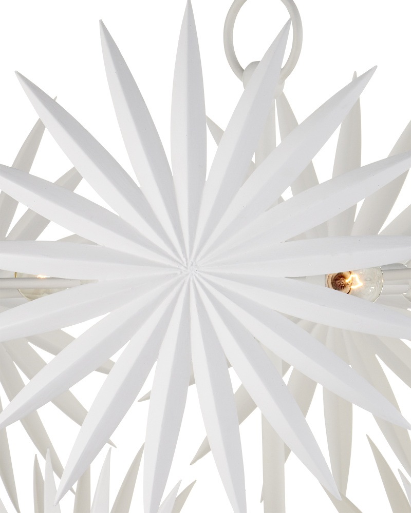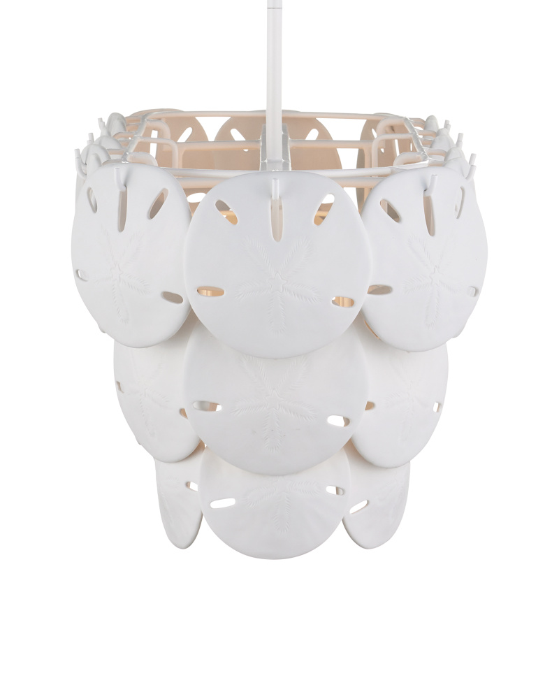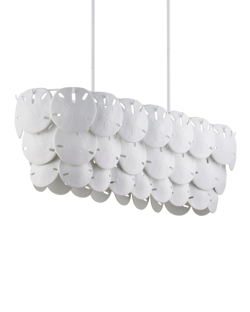 Marjorie Skouras designed the Tulum Oval Chandelier, inspired by the tropical beauty of the Yucatan Peninsula where she lives. This is an elegantly delicate design, as the sand dollars are cast in semi-translucent bone China and they make a pretty sound when a strong breeze ruffles them. There are three sizes of removable sand dollars on this design, which makes it easy to clean. The sugar white finish on the hardware complements the pale discs on this nature-inspired chandelier, making it apropos for rooms overlooking the ocean. Adjustable from 17.5" to 59.5" with use of included chain/rod kit/cable. If your space calls for a longer drop, additional chain/rods/cable is available for purchase.