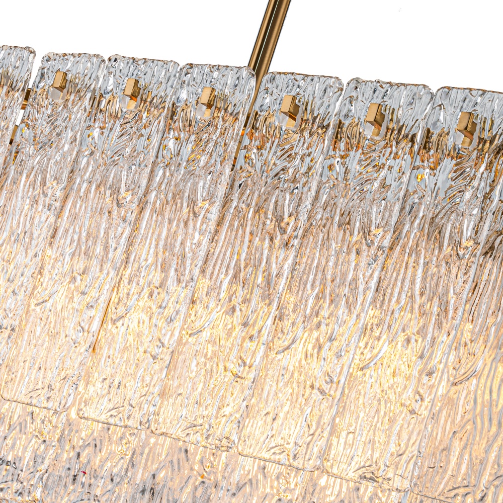 The Tundra Linear Grand extends the collection’s glacier-inspired aesthetic into a bold linear design. Two stacked rows of artisanal textured glass create a waterfall of refracted light, ideal for elongated dining tables, kitchen islands, or hospitality interiors. Its crisp geometry and luminous depth make this piece a signature Kanova statement.