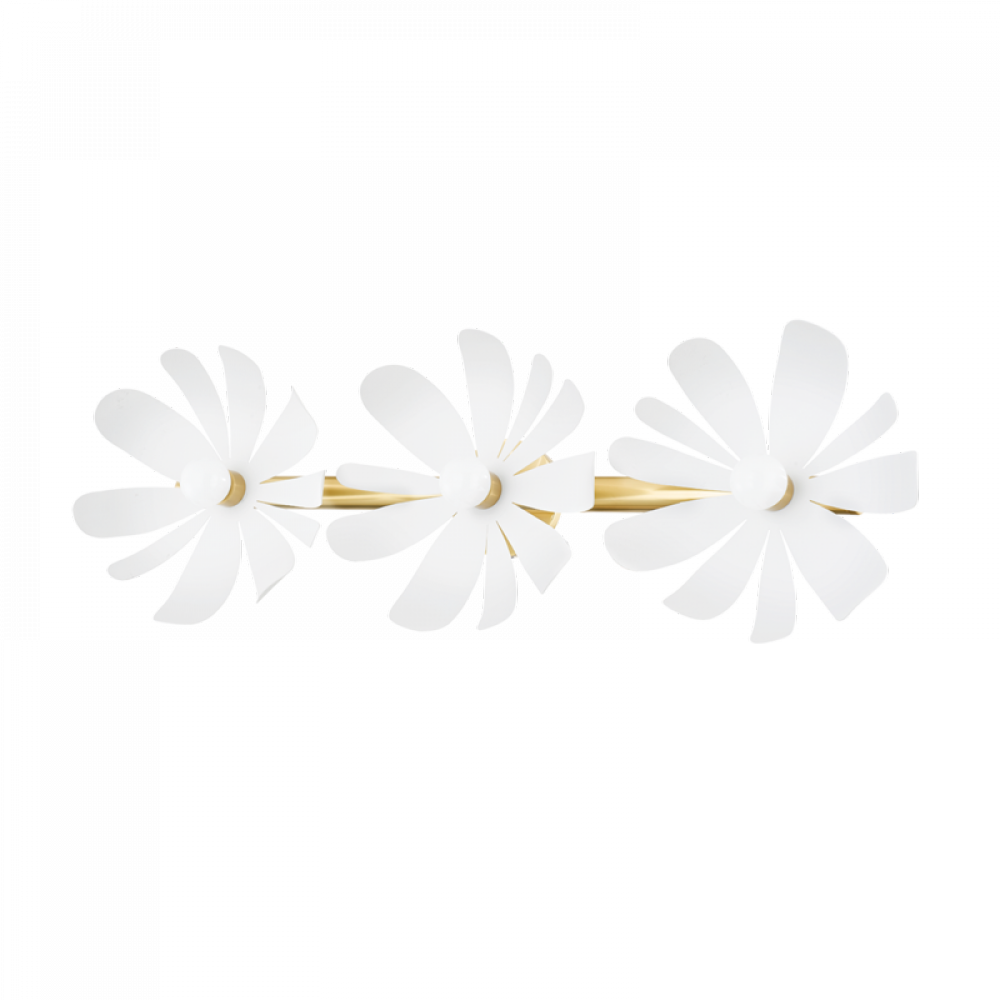 Pretty with a retro flair, Twiggy is floral inspiration at its finest. Different-sized textured white petals sprout from a petite opal matte bulb at the center. The aged brass accents add a pop of shine without taking away from the piece's organic feel. Twiggy offers an entire bouquet of options including a one- or three-light wall sconce, a 3-light semi flush and a 3-light floor lamp.