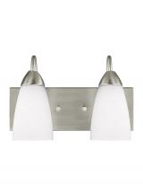 The Seville two light vanity fixture in bronze offers shadow-free lighting in your powder room, spa, or master bath room. The Seville collection represents commitment to high style at a sharp price. The modernist design is epitomized by the teardrop curves in the arms tipped by Etched glass diffusors throughout the chandeliers and bath fixtures. The collection offers a whole home lighting solution in every imaginable category. The assortment includes nine-light, five-light, and three-light chandeliers (either with up-light or down-light), pendants in four sizes as well as one-light, two-light, three-light , four-light and five-light wall/bath fixtures. Install a stylish and elegant addition to any room in the house. Seville is offered in Brushed Nickel and Burnt Sienna finishes.