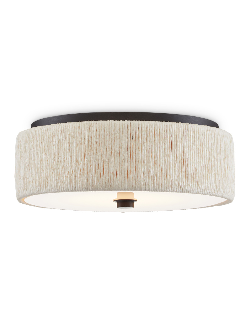 The exterior of the shade of the Tyrone Flush Mount is wrapped in recycled paper that has been twisted like braided hair. The paper is painted white to blend with the white diffuser affixed to this ivory flush mount. The wrought iron ceiling mount and finial nicely contrast the crispness of this design. The Tyrone is fitted with integrated LED technology.