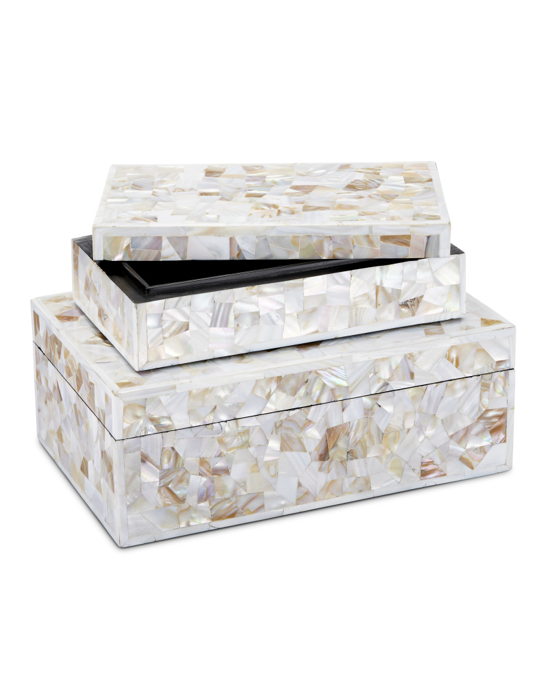 The Uma Mother of Pearl Box Set includes two decorative boxes that have been painstakingly covered in a random pattern of mother of pearl. Given the different hues this natural material exhibits from piece to piece, a lively textural feel is created when the crisp ivories and pale tans are intermingled. This set of beige decorative boxes is as artisanal as accessories come.