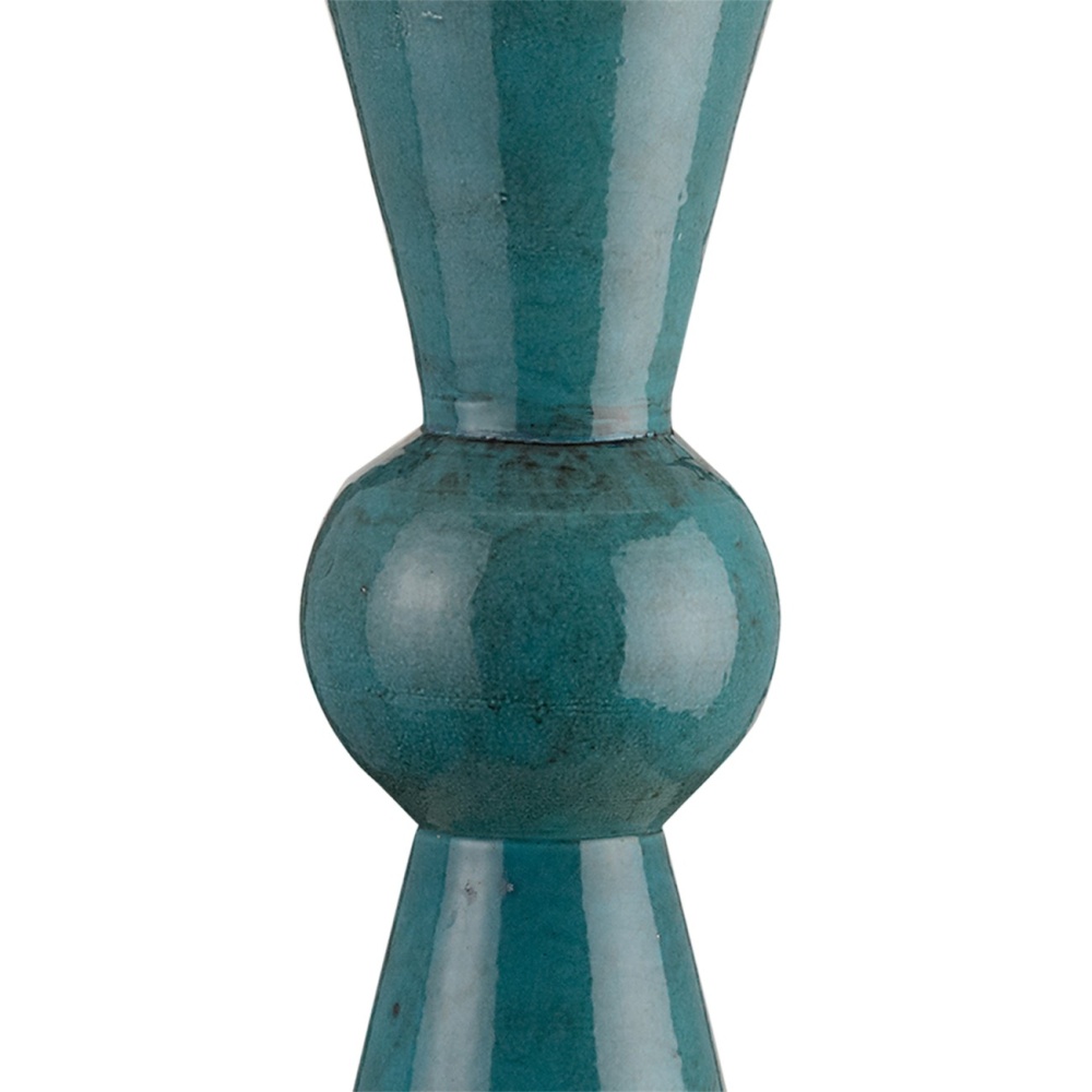 The Upbeat Teal Table Lamp is mod in style. The shapely terracotta body has a center ball with cones extending up toward an off-white linen shade and downward to its culmination. The shade is fastened with a wrought iron finial.
