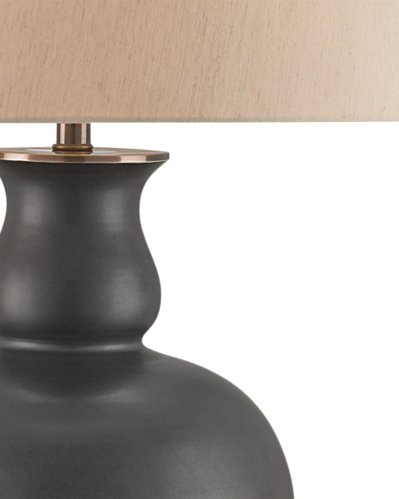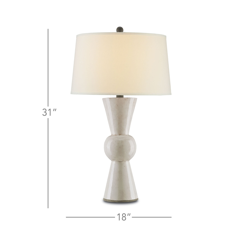 This antique white version of the Upbeat Table Lamp belongs to a series of luminaries that can only be called the mod squad with their time-honored colors that harken back to the era of cool. Also available in teal, orange, gray and yellow, the shapely terracotta base has a center ball with expressive cones extending up toward an off-white linen shade and downward to its culmination. The shade is fastened with a wrought iron finial that matches its hardware and culminates the 31-inch tall profile of the lamp.
