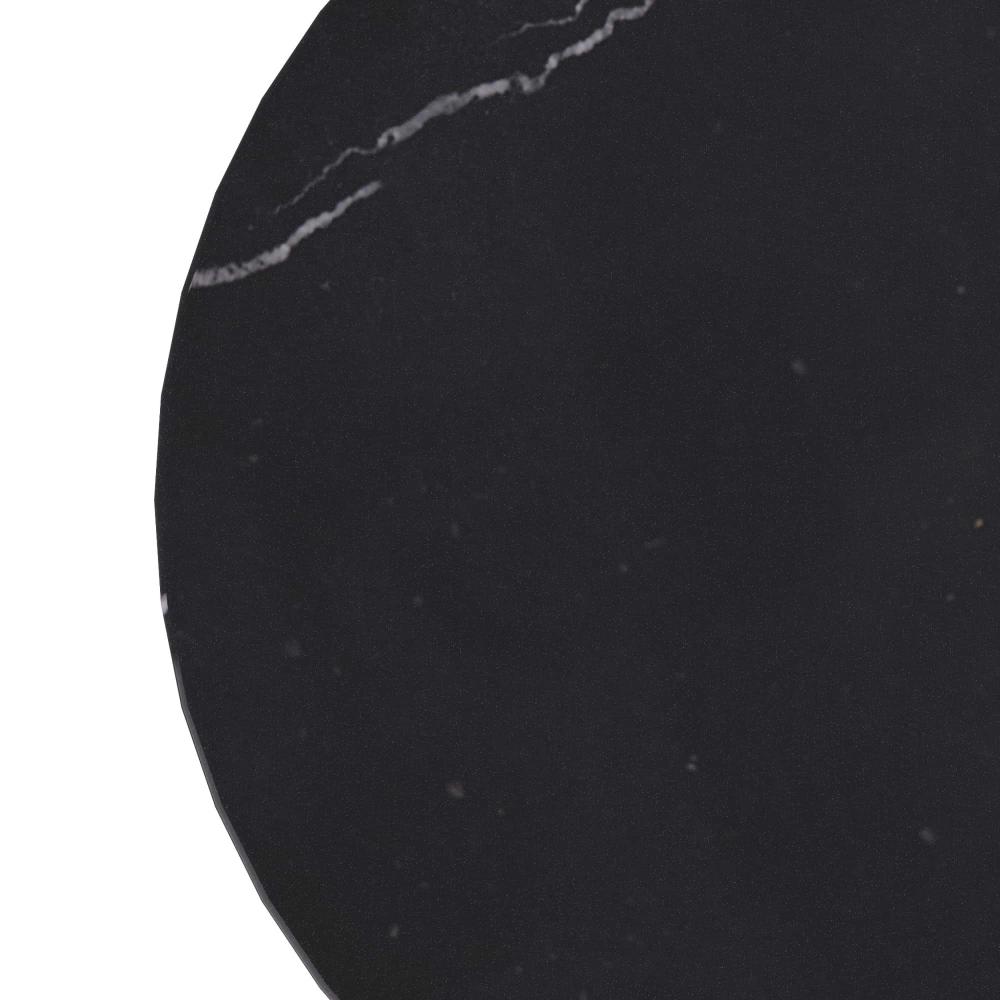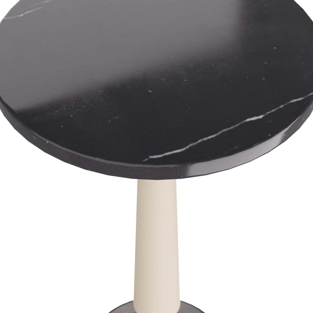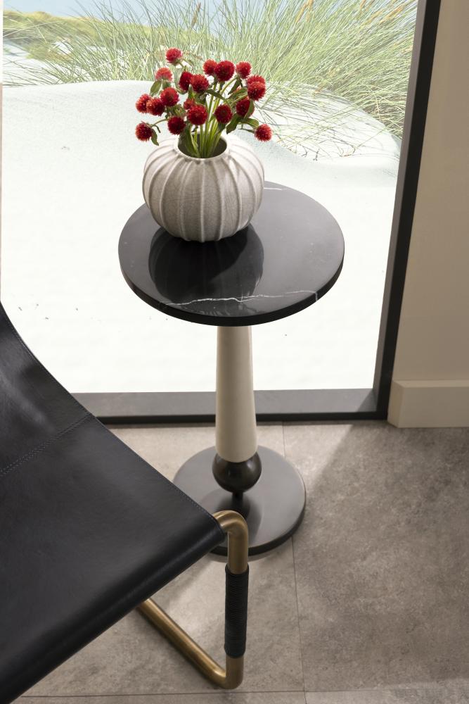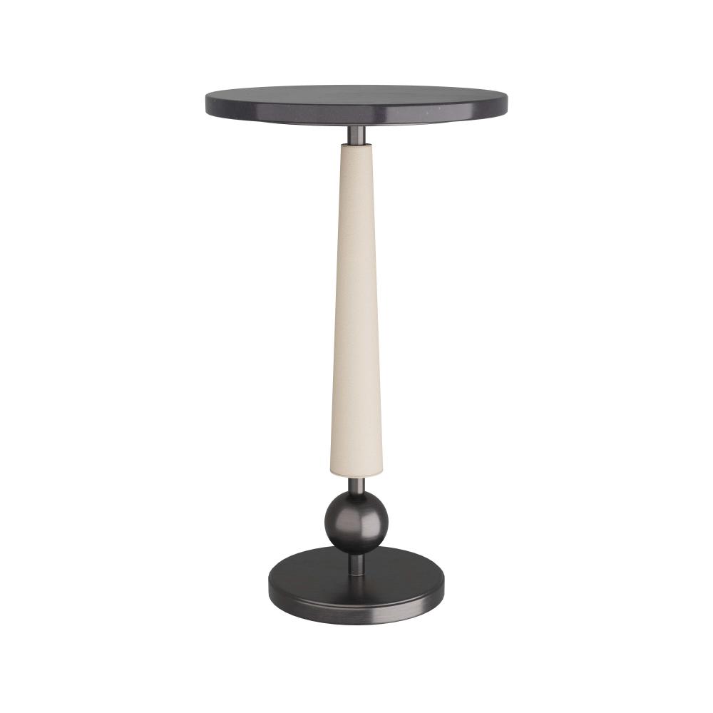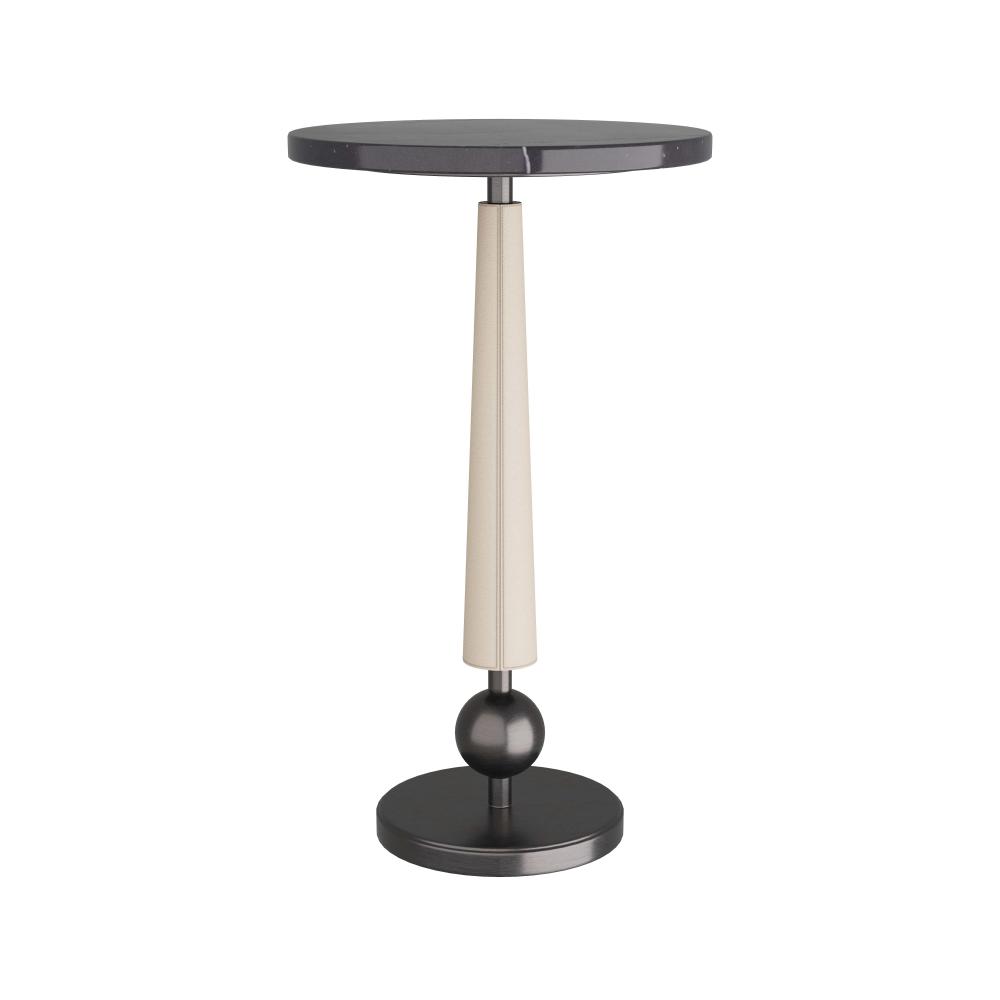 DIMINUTIVE YET DYNAMIC, THE VALARI DRINK TABLE IS LAVISHED IN A CONTRASTING COMPOSITION OF MATERIALS. THE MIXED-MEDIA TABLE IS CLEVERLY DESIGNED WITH A TAPERED IVORY LEATHER POST THAT SUPPORTS A BLACK MARBLE TOP. A BRONZE IRON PLATE BASE WITH A GRAPHIC BALL DETAIL COMPLETES THE IMAGINATIVE TABLE. FINISH WILL VARY.