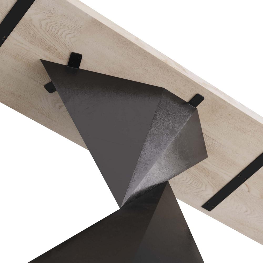 SLEEK AND MODERN, OUR VALDER CONSOLE WAS INSPIRED BY THE TIGHT PAPER FOLDS IN ORIGAMI AND REIMAGINED AS A TWISTED, FACETED, BLACKENED-BRONZE IRON PEDESTAL BASE WITH A HIGH-CONTRAST SMOKE OAK TOP. FINISH WILL VARY.