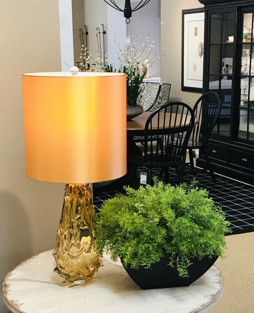 Lucas + McKean's newest glass table lamp, the Valencia shows off our historical design inspiration with the use of a traditional French Wire design, and the glamourous shape and color. More than just functional for your modern home, this orange and amber table lamp lends artful appeal to your space as it shines. Try adding one to your entryway to add warmth as your guests arrive or in the nursery suite for a mini makeover. Crafted from a circular, translucent glass base showing the pulled and sculpted effect, it's topped off with an empire shade in a matching hue for a finished look.