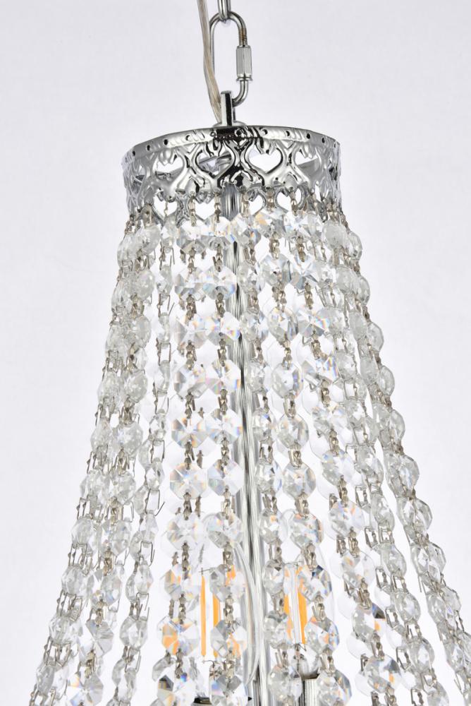 Tiers of clear multi-faceted crystals reflect the soft glow of candelabra bulbs