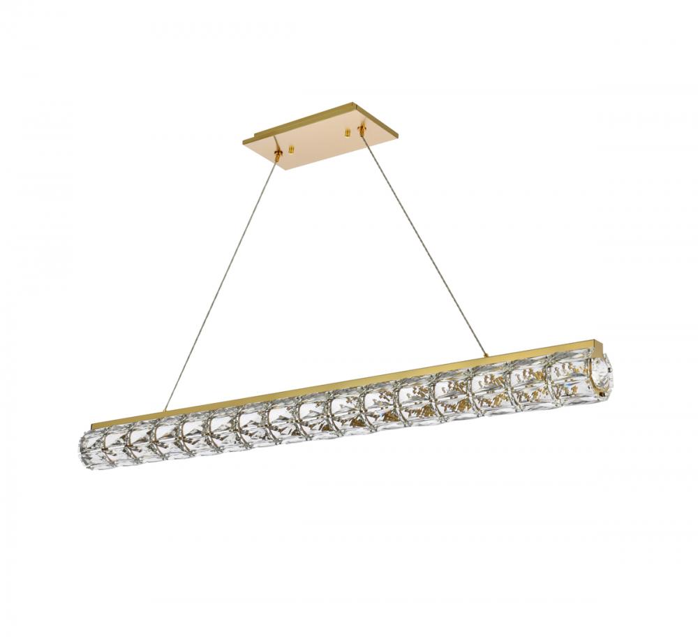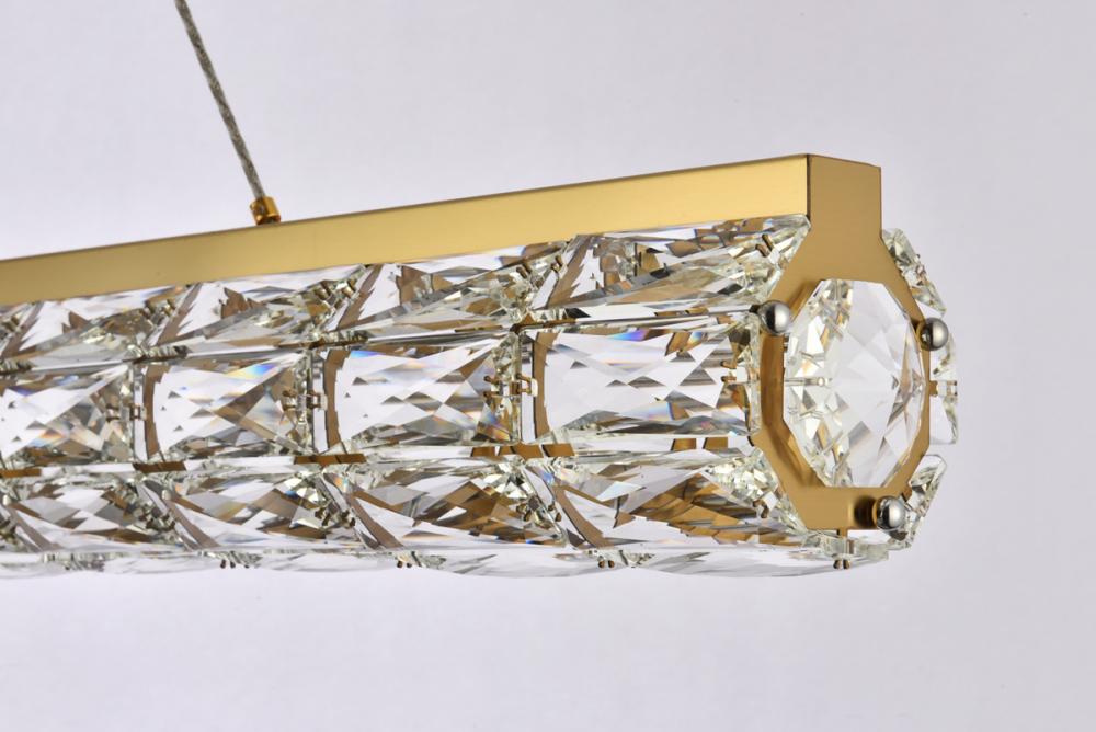 Valetta hanging fixtures dress up a living room, dining room, or bedroom without overwhelming the surrounding décor. This collection features an octagonal tube-shaped stainless-steel frame that’s covered almost entirely with shining rectangular clear crystals. A rectangular mounting plate is connected to the frame by slender cables that keep everything secure. A sleek metal finish completes this modern look with warm led lighting. Available in three sizes.