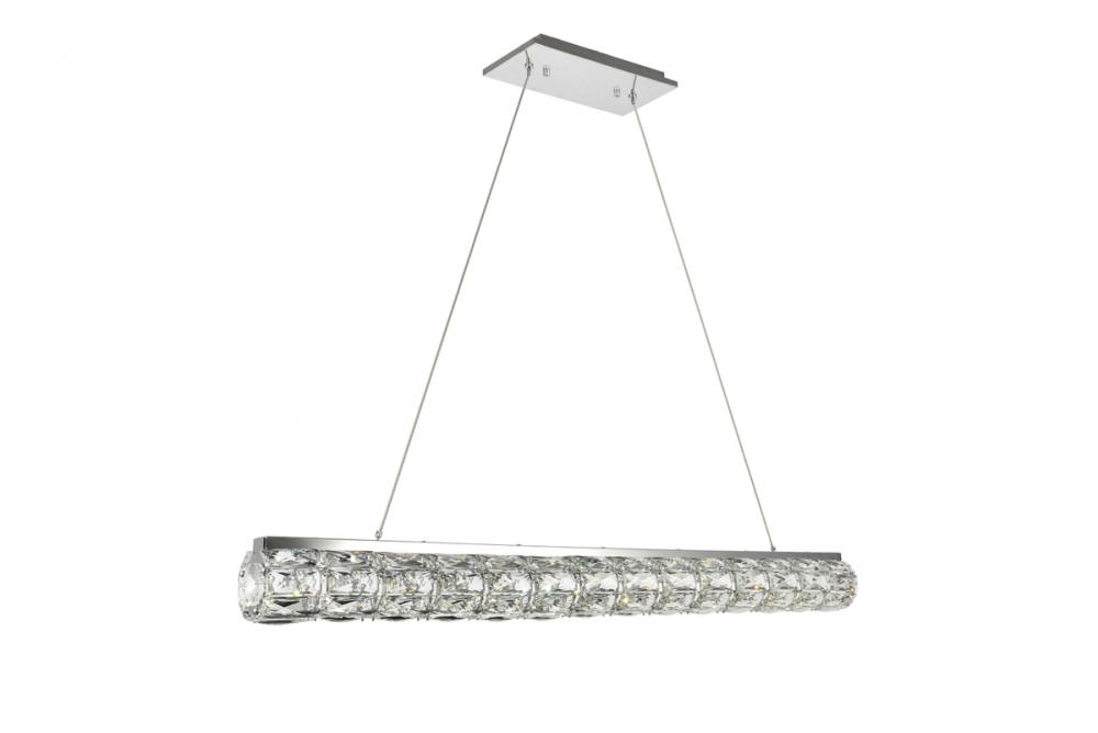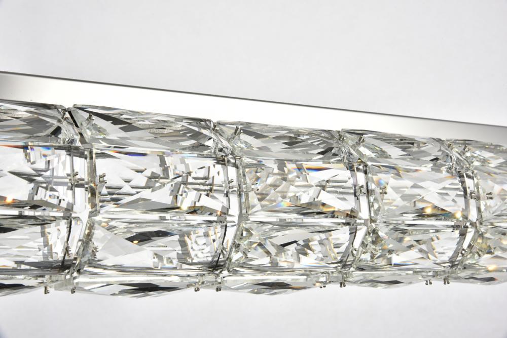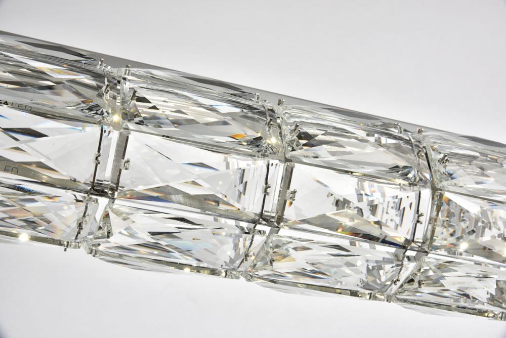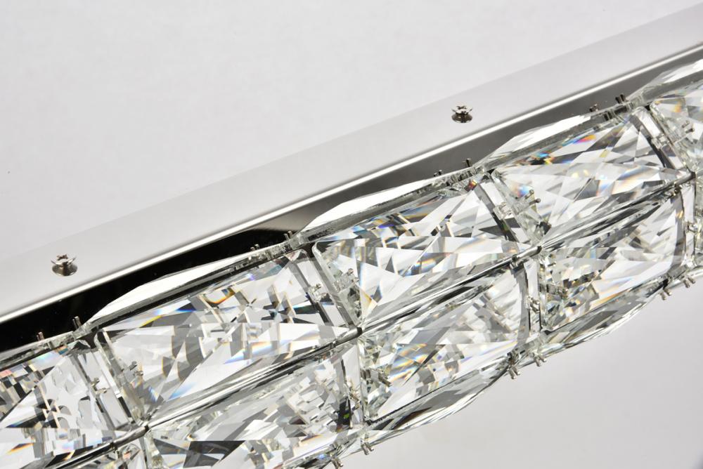 Valetta hanging fixtures dress up a living room, dining room, or bedroom without overwhelming the surrounding décor. This collection features an octagonal tube-shaped stainless-steel frame that’s covered almost entirely with shining rectangular royal-cut clear crystals. Faceted crystal octagonal crystals cover both ends as a charming finishing touch. A rectangular mounting plate is connected to the frame by slender cables that keep everything secure. A sleek chrome finish completes this modern look. Available in three different lengths.