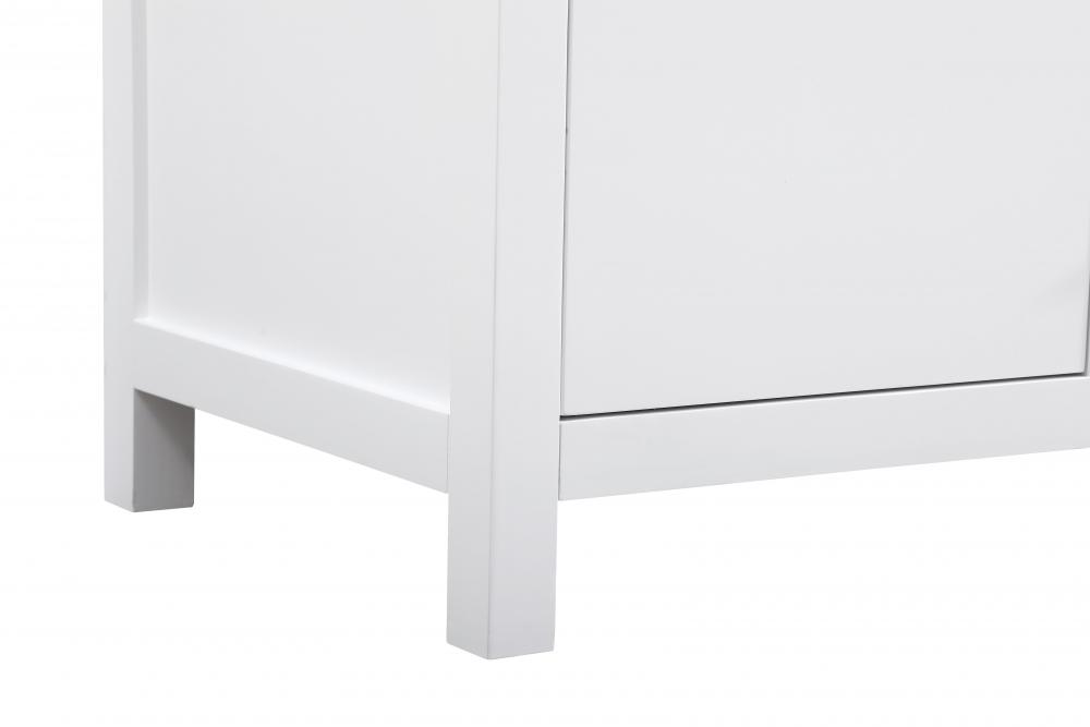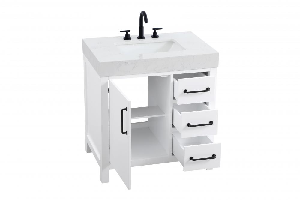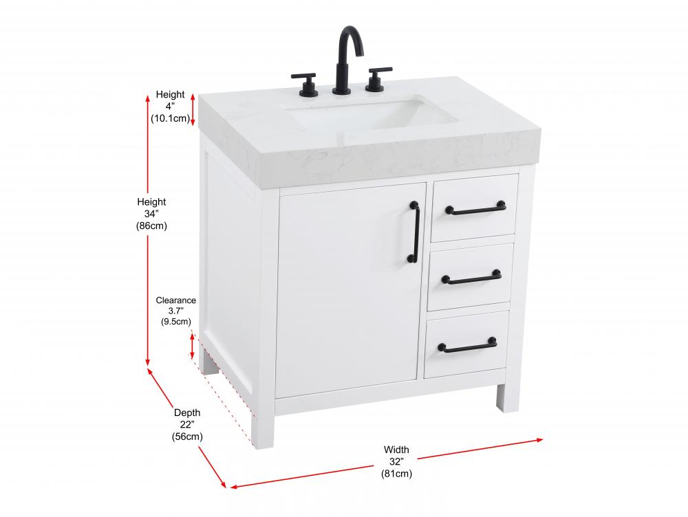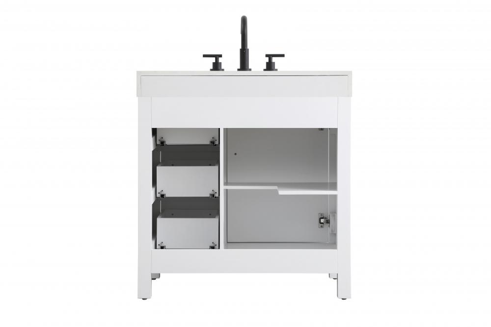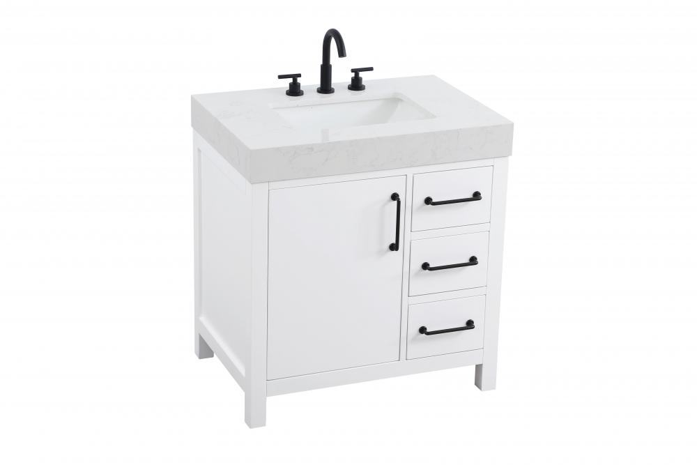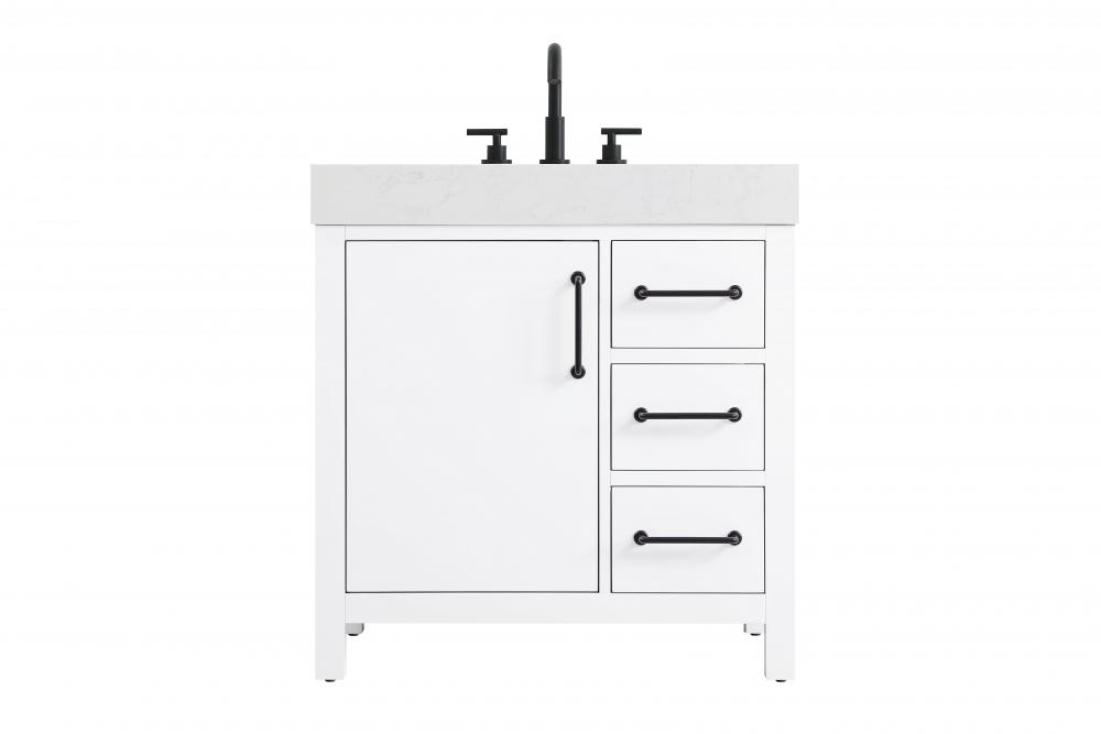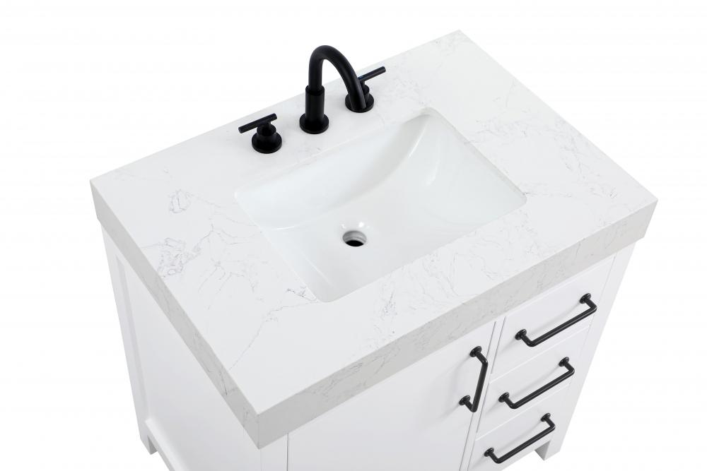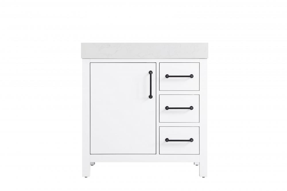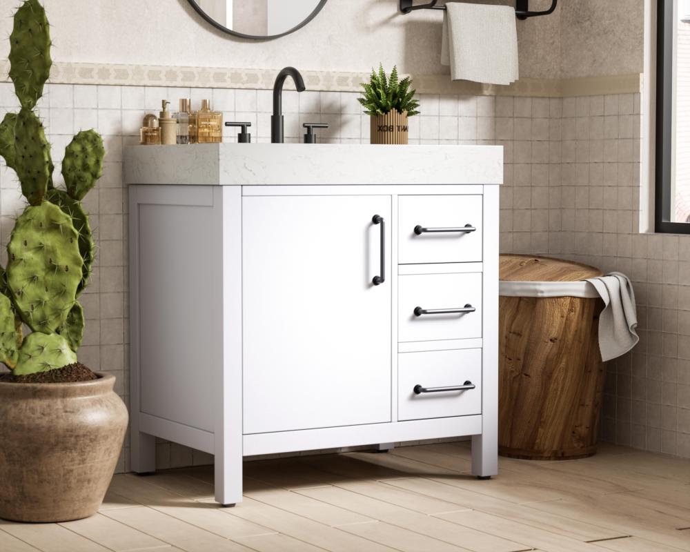 This bathroom vanity exudes a clean and structured design, making it a versatile addition to modern and transitional bathrooms. The bright white finish enhances the room's sense of light and space, creating a crisp and refreshing appearance. Elevate your bathroom functionality with this thoughtfully designed bathroom vanity cabinet. The standout feature is the engineered marble countertop, boasting a bold 4-inch thickness and natural veining for a striking visual appeal. The vanity features a functional layout, with two cabinet doors on one side and three stacked drawers on the other, creating a balanced and organized look. Matte black hardware, including slim and cylindrical pulls, contrasts elegantly against the white wood, reinforcing its contemporary vibe while providing subtle visual interest. This vanity is perfect for those seeking a design that combines modern simplicity with a touch of bold refinement. This vanity is delivered fully assembled and equipped with foot levelers for effortless installation and stability. Complete the setup with an optional matching backsplash, sold separately. Combining practicality and bold design, this vanity is UPC certified and ready to transform your bathroom space.