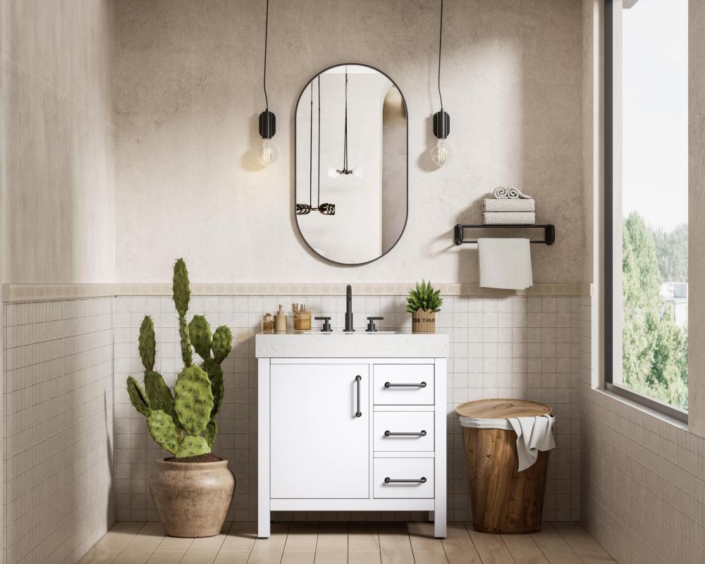 The door pulls are sleek, cylindrical handles in a matte black finish, providing a striking contrast to the white finish of the vanity.