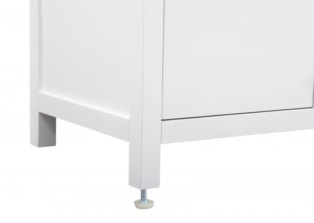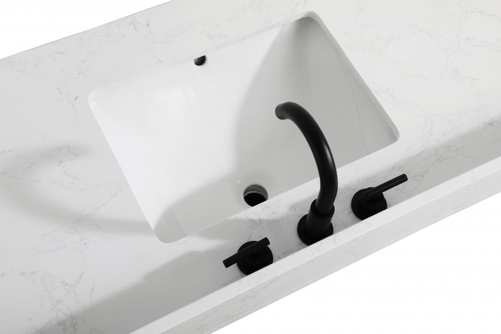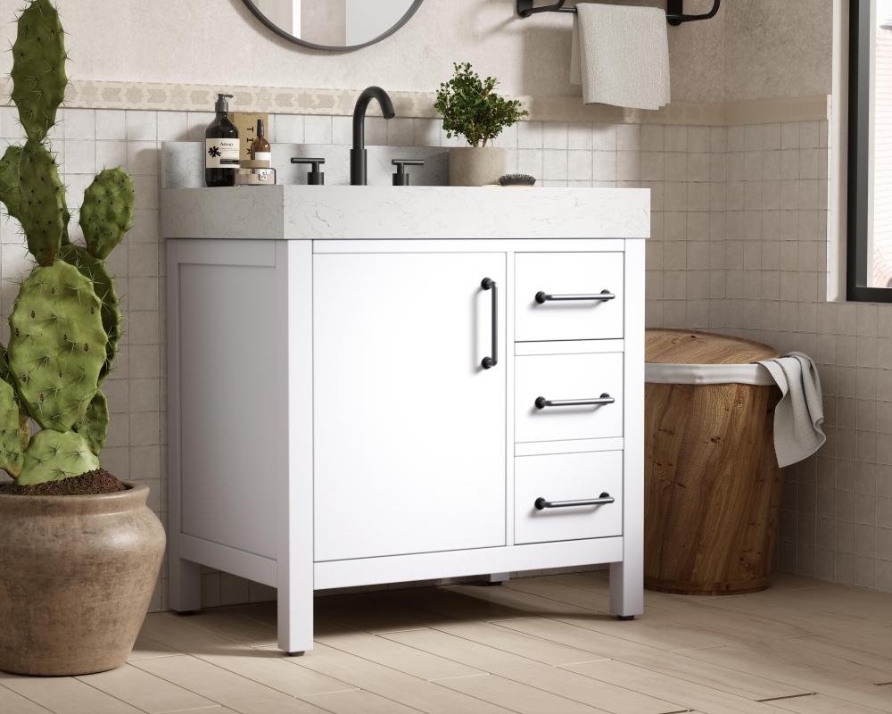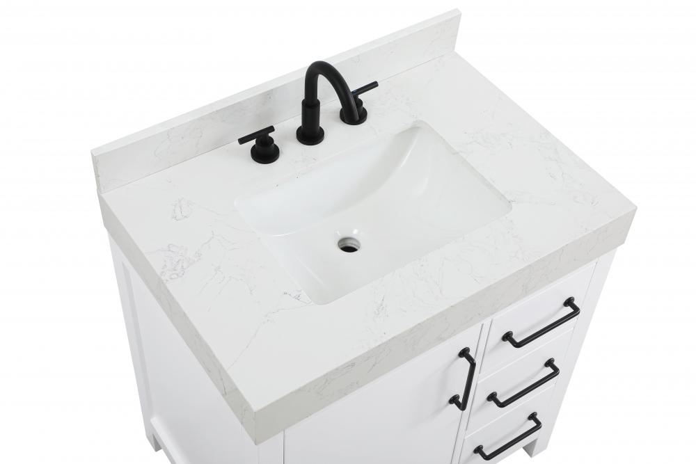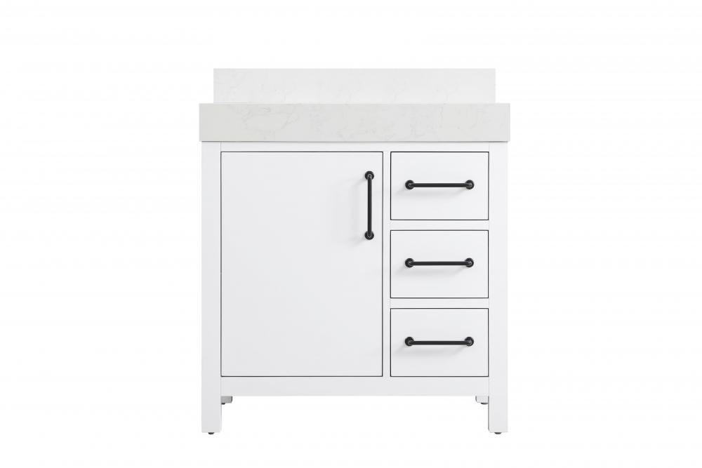 This bathroom vanity exudes a clean and structured design, making it a versatile addition to modern and transitional bathrooms. The bright white finish enhances the room's sense of light and space, creating a crisp and refreshing appearance. Elevate your bathroom functionality with this thoughtfully designed bathroom vanity cabinet. The standout feature is the engineered marble countertop, boasting a bold 4-inch thickness and natural veining for a striking visual appeal. The vanity features a functional layout, with two cabinet doors on one side and three stacked drawers on the other, creating a balanced and organized look. Matte black hardware, including slim and cylindrical pulls, contrasts elegantly against the white wood, reinforcing its contemporary vibe while providing subtle visual interest. This vanity is perfect for those seeking a design that combines modern simplicity with a touch of bold refinement. This vanity is delivered fully assembled and equipped with foot levelers for effortless installation and stability. Combining practicality and bold design, this vanity is UPC certified and ready to transform your bathroom space. The matching backsplash seamlessly integrates with the countertop, offering a cohesive design that protects walls from splashes while maintaining a unified look.