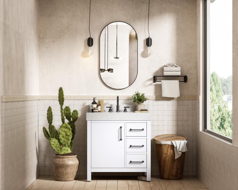 The door pulls are sleek, cylindrical handles in a matte black finish, providing a striking contrast to the white finish of the vanity.