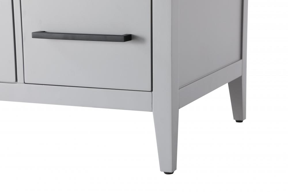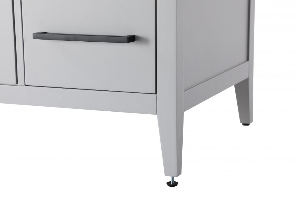 The vanity stands on tapered 5-inch solid wood legs with levelers for a balanced, polished look, combining modern style with practicality.