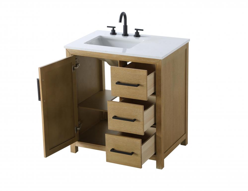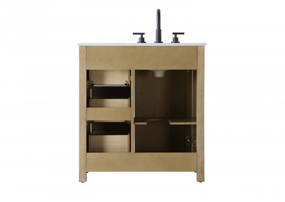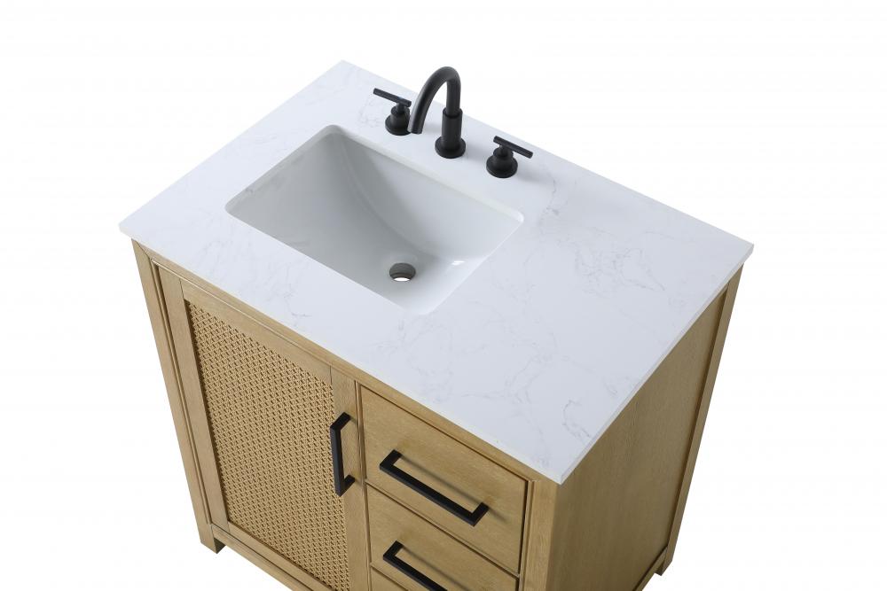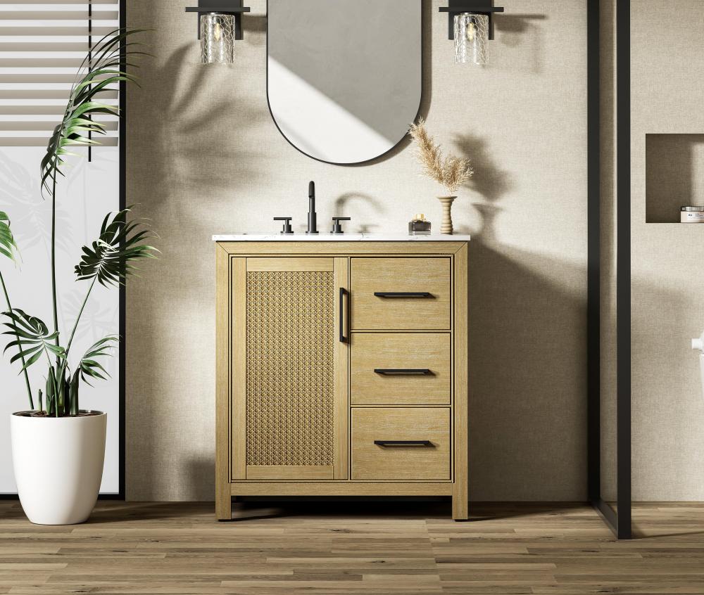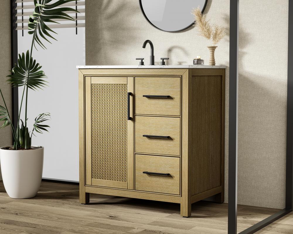 Perfect for those with an eye for detail and quality, this transitional vanity blends modern design with timeless elegance. Available in five stunning finishes, from Crisp White to Linen Oak, the wood grain visuals of the oak options bring warmth and character to any bathroom. The caning design on the Shaker-style door panels adds texture and a touch of refinement, while the soft-closing doors and drawers ensure smooth, quiet functionality. Topped with a white engineered marble countertop, the vanity offers both luxury and practicality, complete with pre-drilled faucet holes for customization. A concealed overflow and U-shaped shelf for plumbing make installation effortless, and the slender black metal pulls provide a sleek contrast.