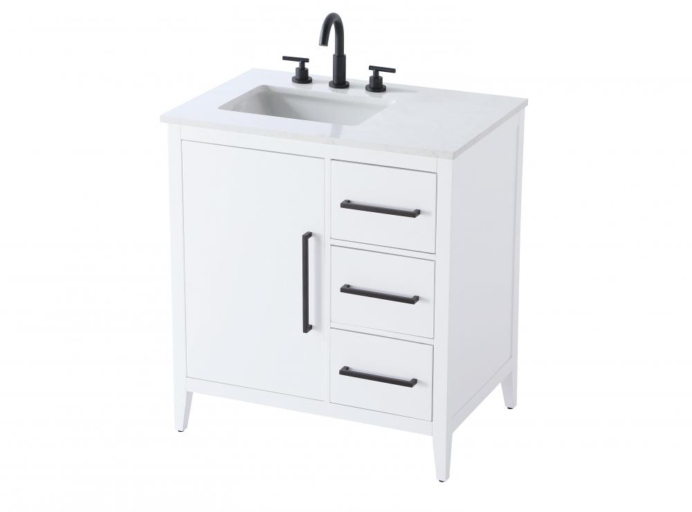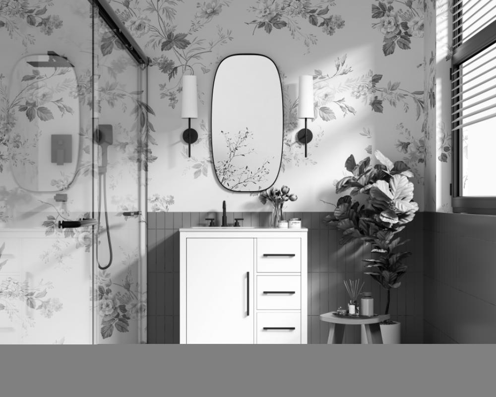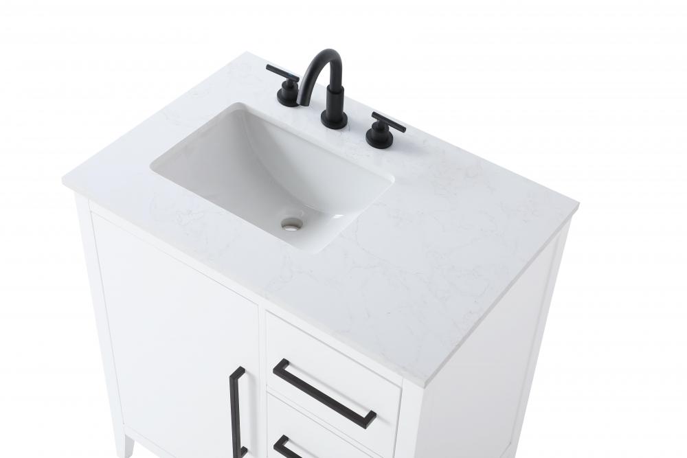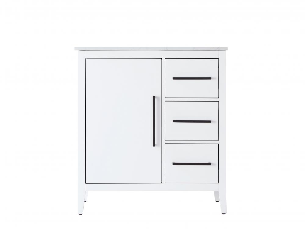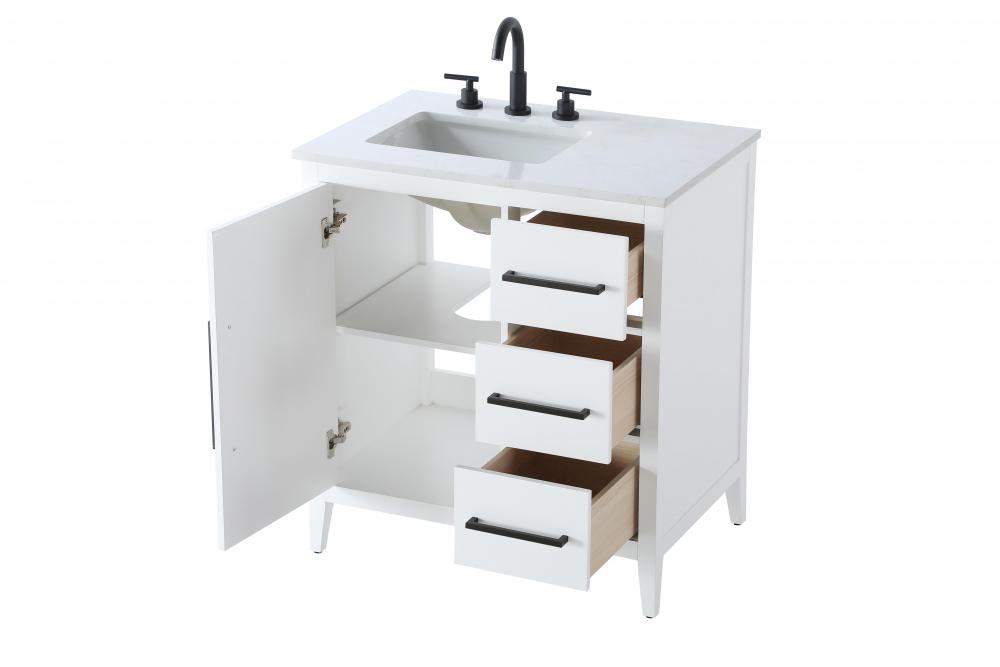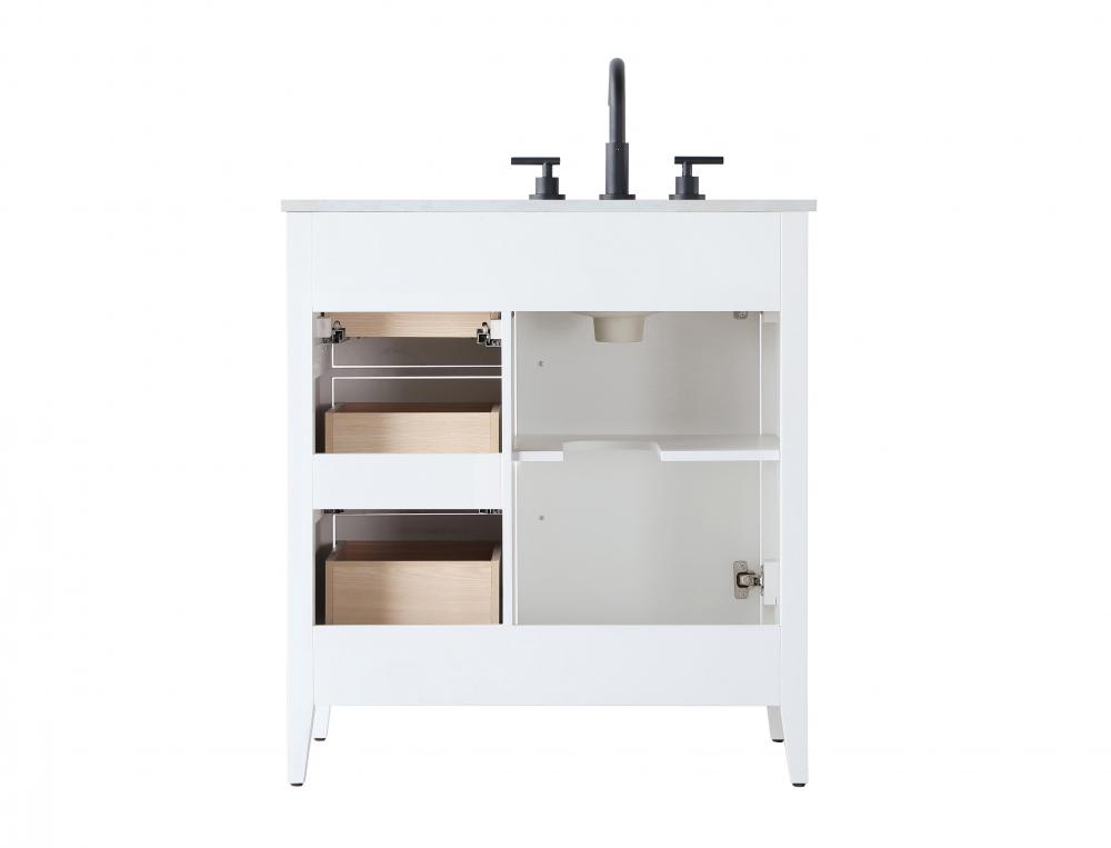 Bring both elegance and practicality to your bathroom with this transitional vanity, available in a selection of rich finishes that highlight the beauty of faux wood grain in shades of mocha, chestnut, and honey, along with classic white and modern grey. The flat door panels and sleek black metal pulls create a minimalist yet refined aesthetic, while the soft-closing drawers and tapered legs with levelers provide smooth, functional operation. Topped with a luxurious white engineered marble countertop and featuring a porcelain sink, this vanity combines timeless style with modern efficiency. Thoughtfully designed with U-shaped cutout for plumbing, it offers ample storage and easy installation, making it the perfect centerpiece for any bathroom.