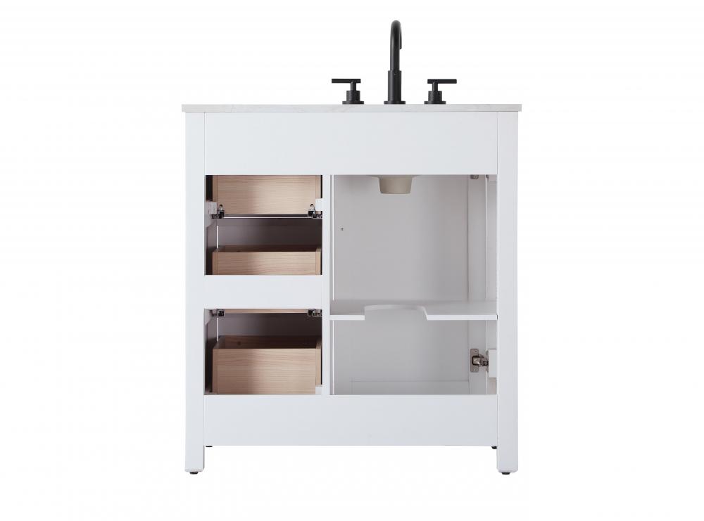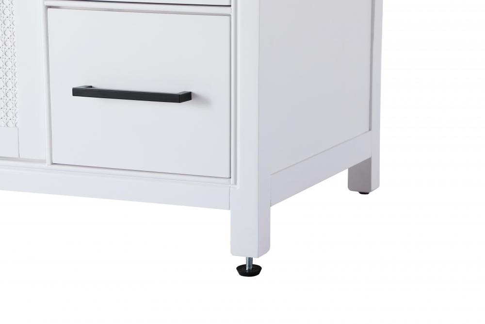 The slender black metal handle pulls on the doors and drawers offer a sleek, modern contrast to the white finish, adding to the vanity's sophisticated look.