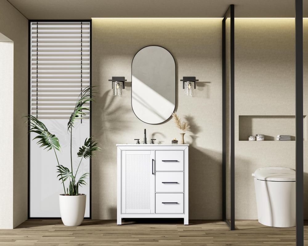 Perfect for those with an eye for detail and quality, this transitional vanity blends modern design with timeless elegance. Available in five stunning finishes, from Crisp White to Linen Oak, the wood grain visuals of the oak options bring warmth and character to any bathroom. The caning design on the Shaker-style door panels adds texture and a touch of refinement, while the soft-closing doors and drawers ensure smooth, quiet functionality. Topped with a white engineered marble countertop, the vanity offers both luxury and practicality, complete with pre-drilled faucet holes for customization. A concealed overflow and U-shaped shelf for plumbing make installation effortless, and the slender black metal pulls provide a sleek contrast.